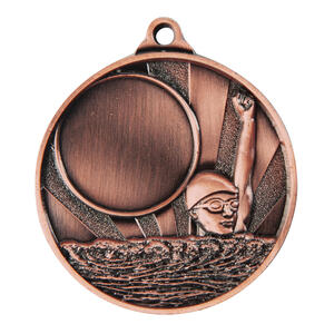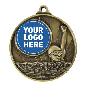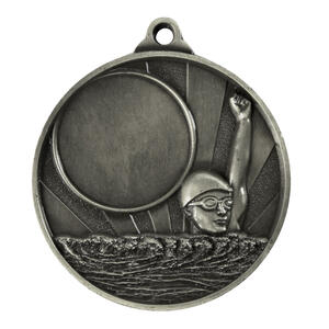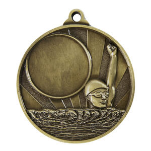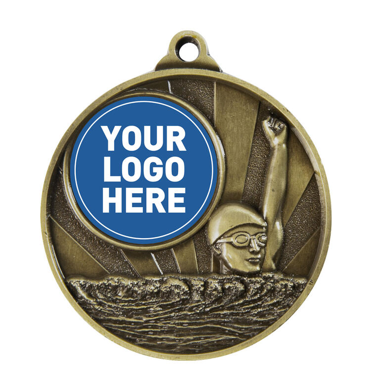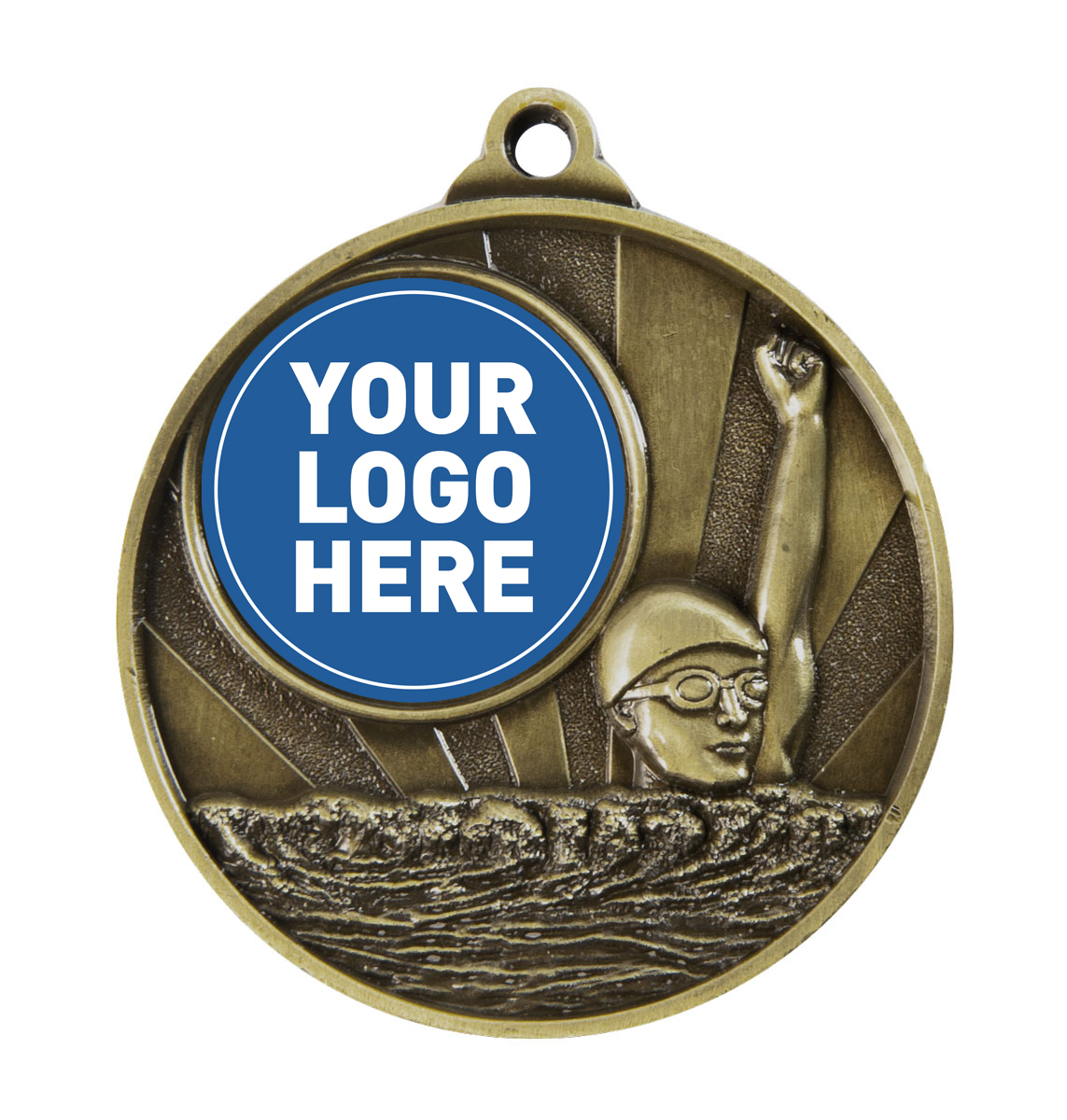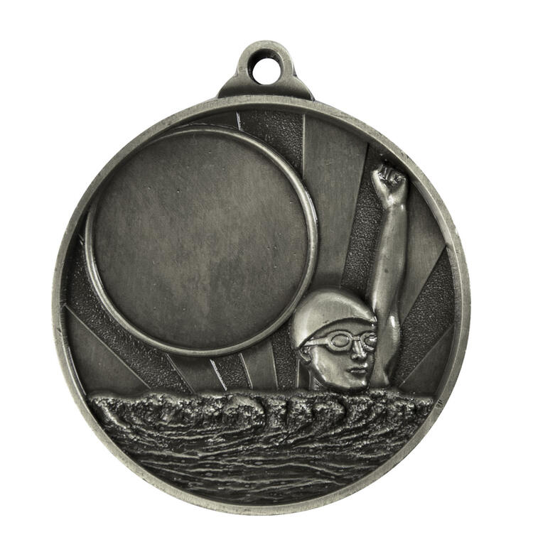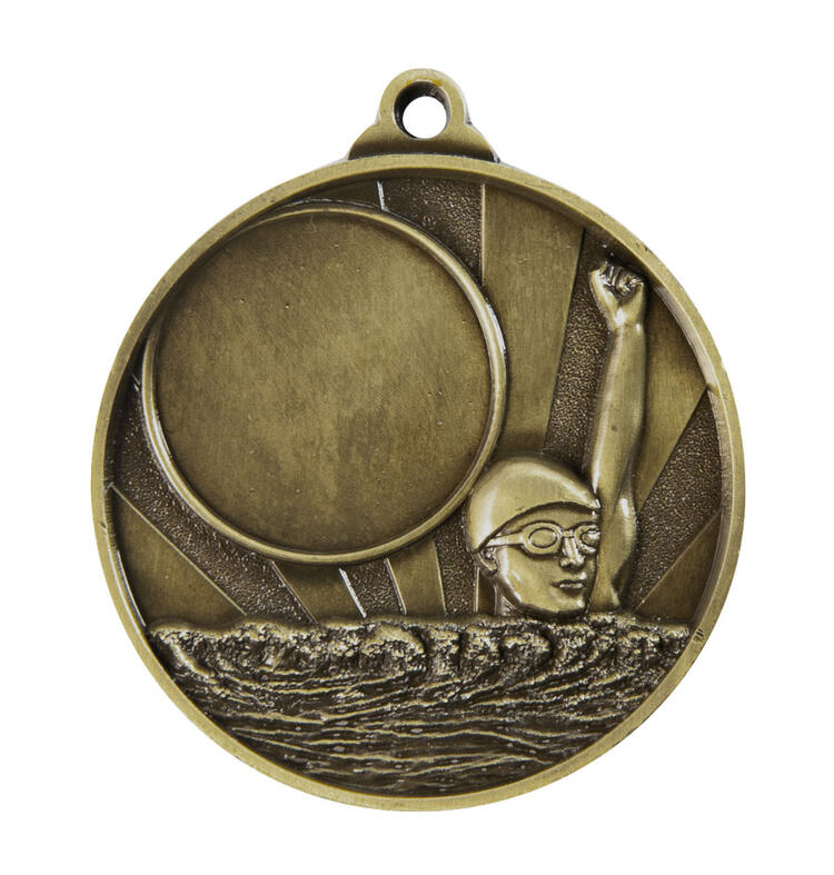 This swimming medal presents a detailed swimmer in action, poised above the water with goggles and swim cap, set against an eye catching sunburst backdrop. Crafted from metal in a classic circular shape, its 50mm size with 25mm centre offer reliable presentation for swimming medals at any event.