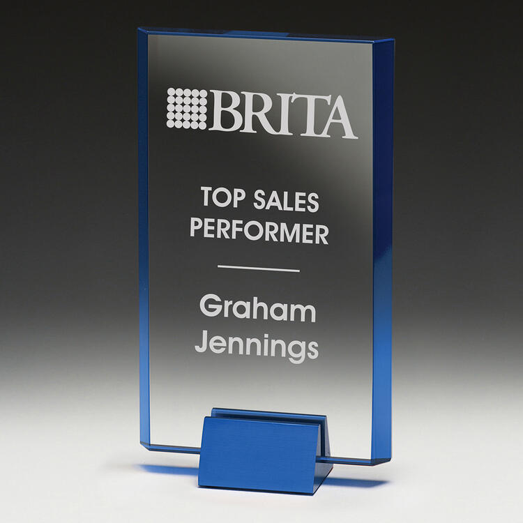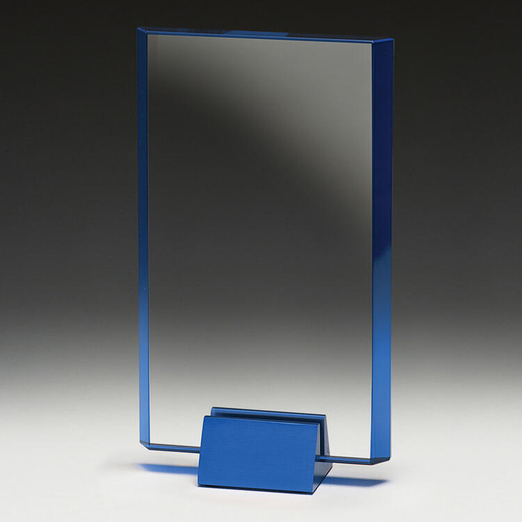 Glass trophies typically have a very slight green tinge, which can subtly affect the appearance of colour printing. In contrast, crystal trophies are completely clear.