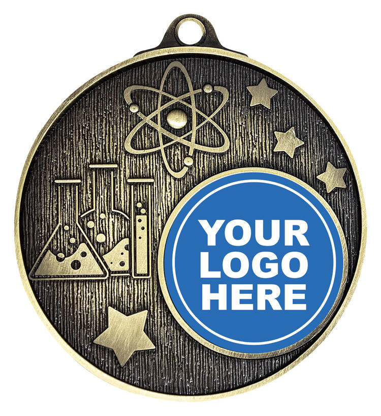 Celebrate achievement in science with this elegant science medal, crafted in high quality metal and finished in a striking gold finish. The circular design features detailed engravings of an atom, stars, and laboratory glassware, creating a memorable symbol of scientific accomplishment. A versatile 52mm size with a 25mm centre ensures it stands out at any science event or school ceremony.