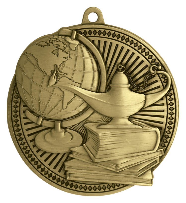 Celebrate scholarly achievement with this gold, circular academic excellence award medal. Crafted from quality metal, it features a detailed design with a globe, a stack of books, and a lamp, capturing the spirit of knowledge and dedication. This elegant piece offers a memorable and trusted way to honour academic distinction.