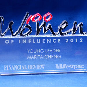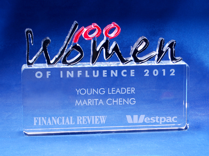 A stunning custom crystal award featuring a water jet cut and hand polished crystal 100 Women design with precision colour detailing.