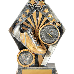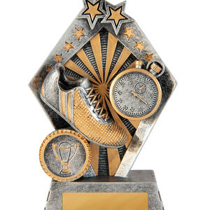 Celebrate achievement in athletics with this thoughtfully crafted trophy from the Sunrise Series. Showcasing a running shoe, stopwatch, and trophy emblem, its design symbolises sporting excellence. Available in a gold and silver finish and crafted from durable resin, this award comes in three sizes and is a trusted choice for athletics medal presentations.
