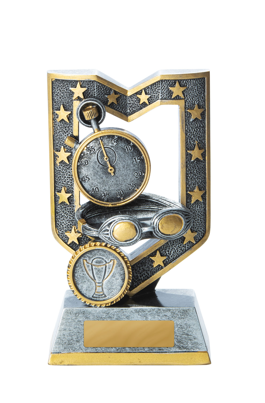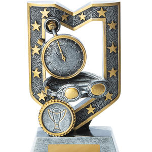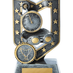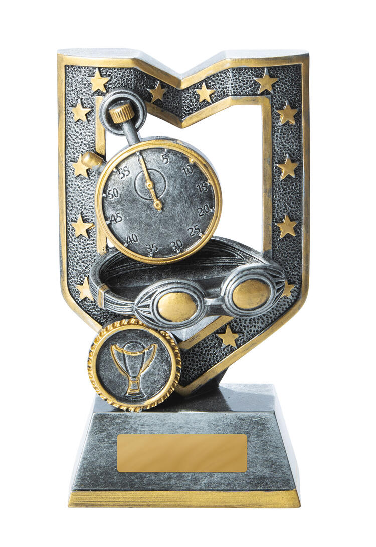 This contemporary swimming trophy combines a striking silver and gold finish with a detailed stopwatch and goggles motif, capturing the essence of competitive swimming. Crafted from quality resin, its trophy like silhouette is accented by a distinguished emblem, creating a memorable symbol of achievement. An ideal choice for sports clubs and schools seeking swimming trophies that deliver both elegance and durability.