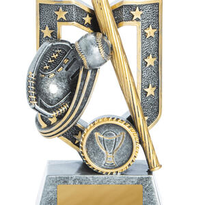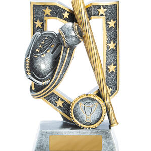 Celebrate baseball achievement with this elegantly crafted baseball trophy from the Aegis Series. Featuring a striking design of a bat, ball, and glove, set within a rectangular frame on a circular base, this award symbolises athletic skill and team excellence. Available in a gold and silver finish, its durable resin material are accented by star decorations and a distinguished trophy emblem for a truly professional recognition piece.