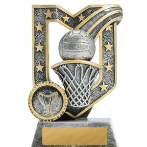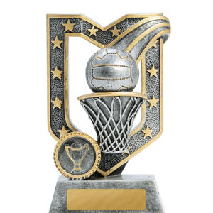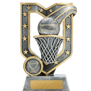 This contemporary trophy stands out in the world of netball trophies with its dynamic curved base and striking 3D star design. The combination of antique silver and gold tones, along with a detailed netball and net motif, creates an elegant tribute to achievement.