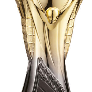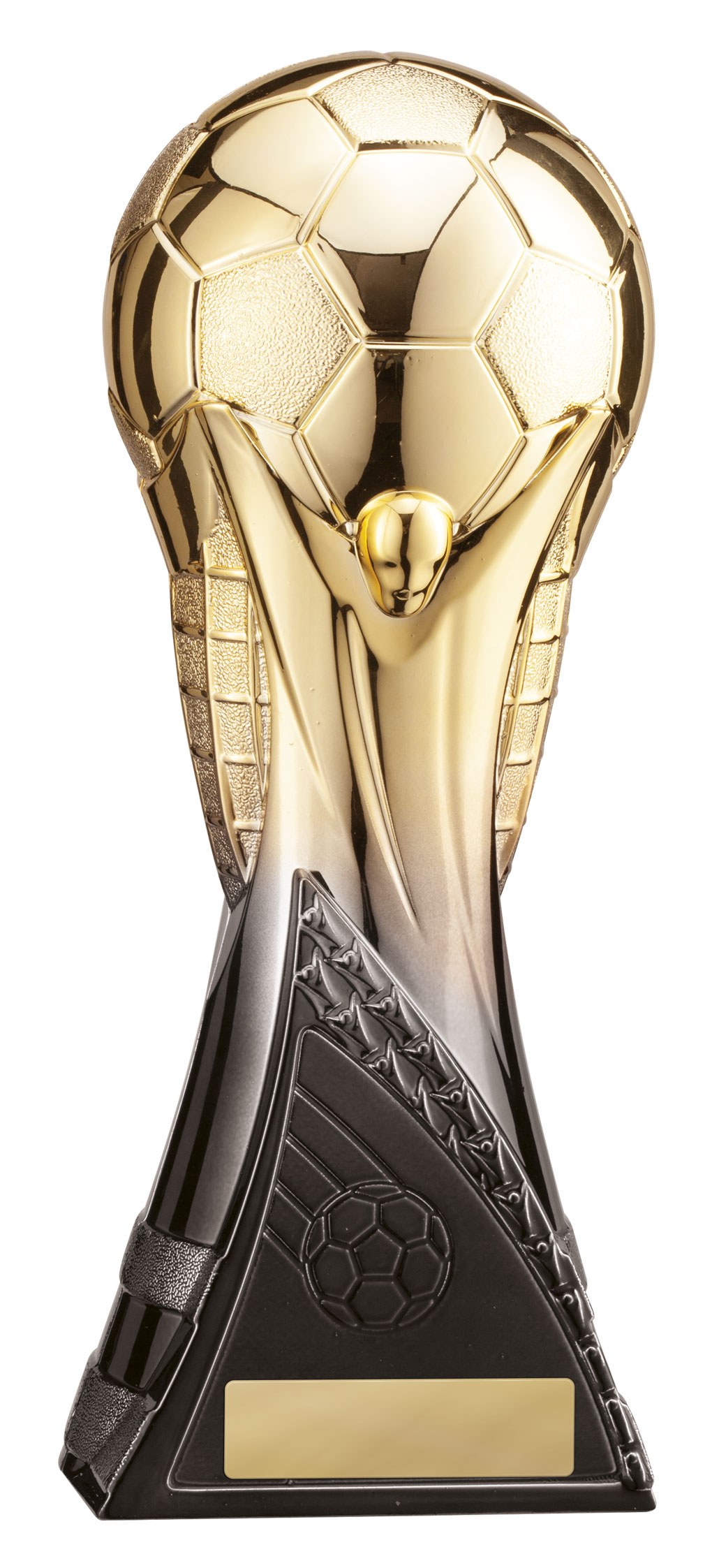 This soccer trophy combines a contemporary shield shaped design with a detailed soccer ball and cleat motif, making it an elegant symbol of achievement. Crafted from resin, its striking black and silver palette is enhanced by pewter and gold accents for a professional finish. The laurel wreath emblem on the base and versatile display options underscore its celebratory appeal.