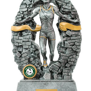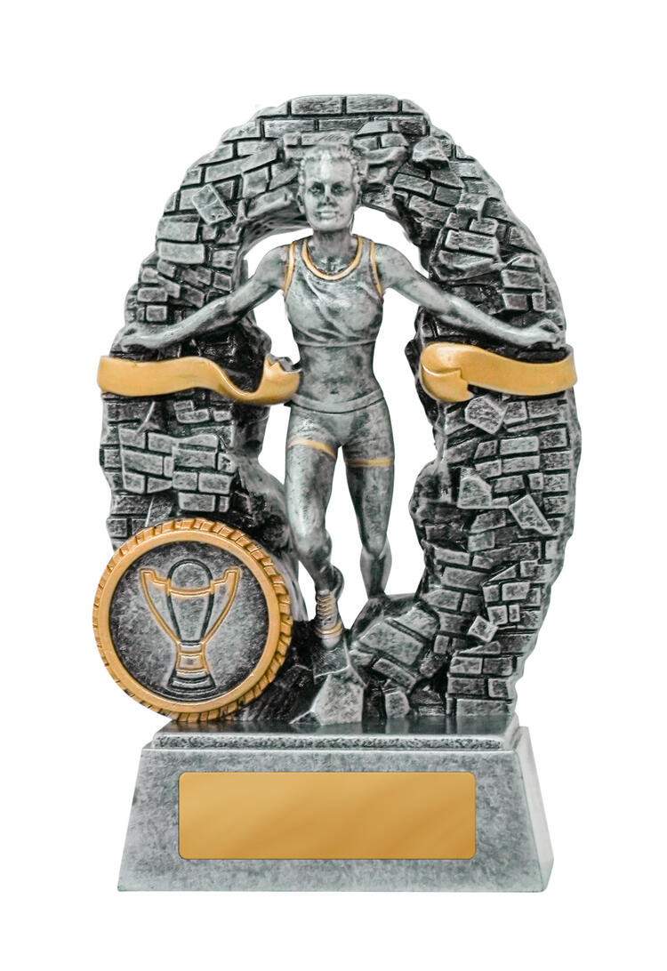This female athletics trophy captures a moment of triumph, featuring a runner breaking through the finish ribbon against a striking brick wall backdrop. Crafted in durable resin with refined silver and gold tones, it conveys both strength and achievement. A round centre at the base provides space for a custom emblem, making this award a memorable choice for recognising outstanding athletes in running events.
