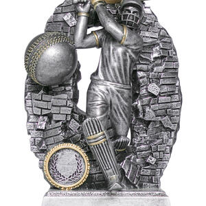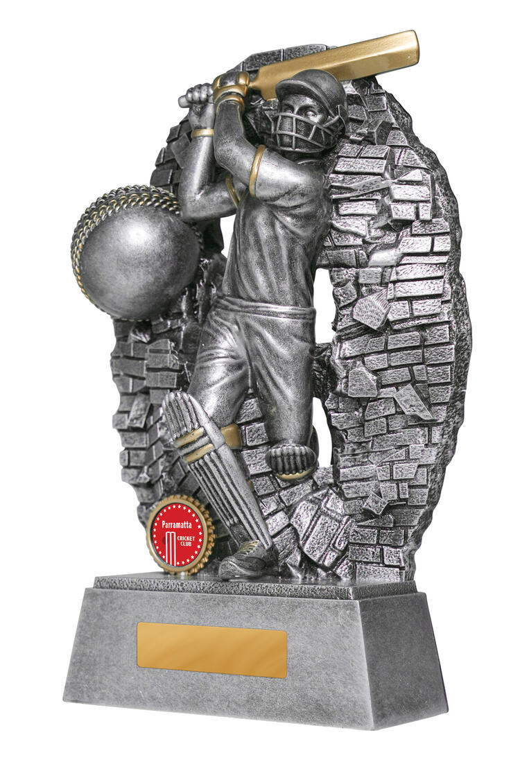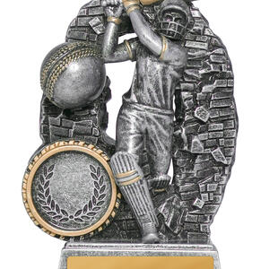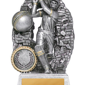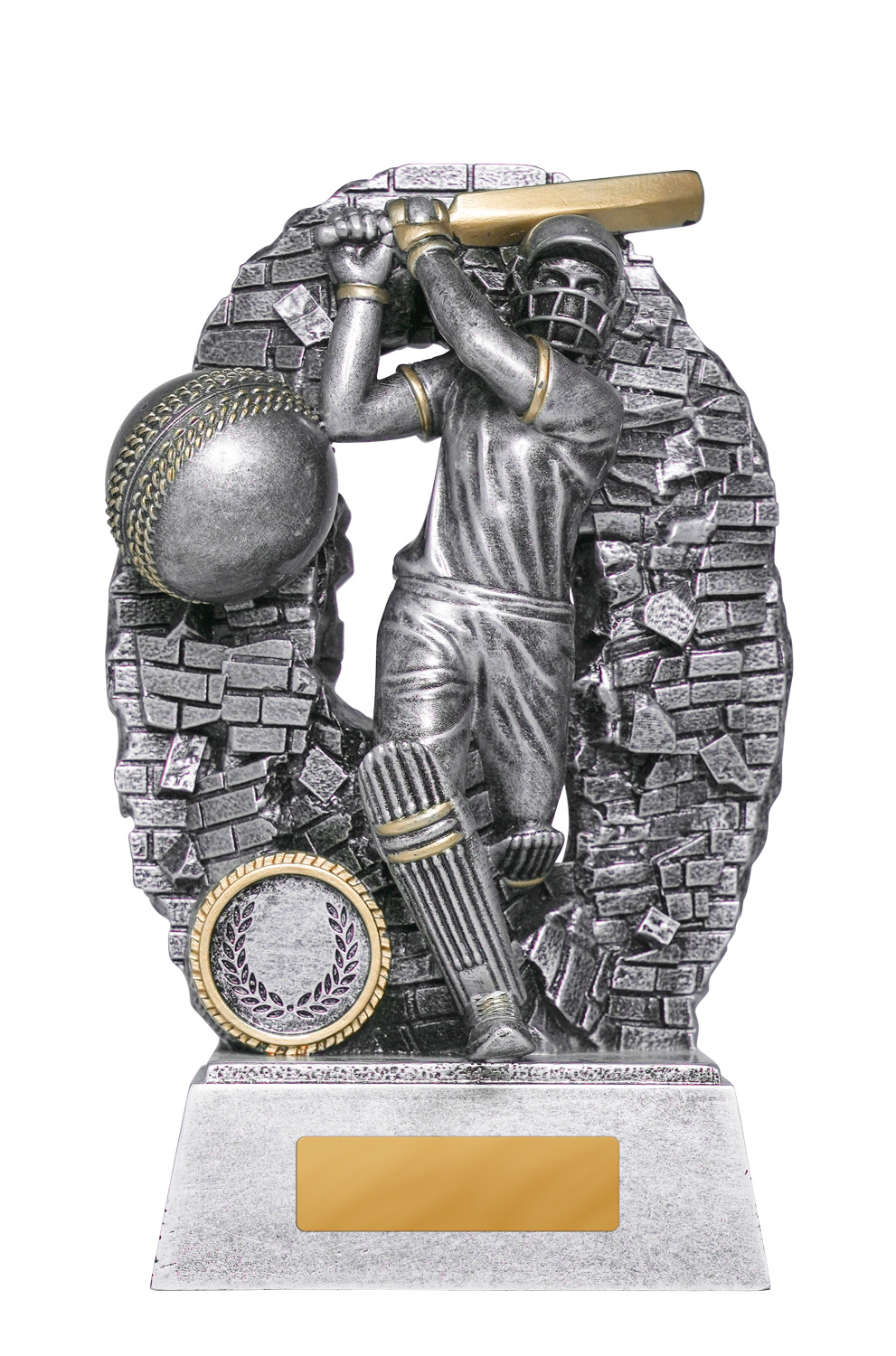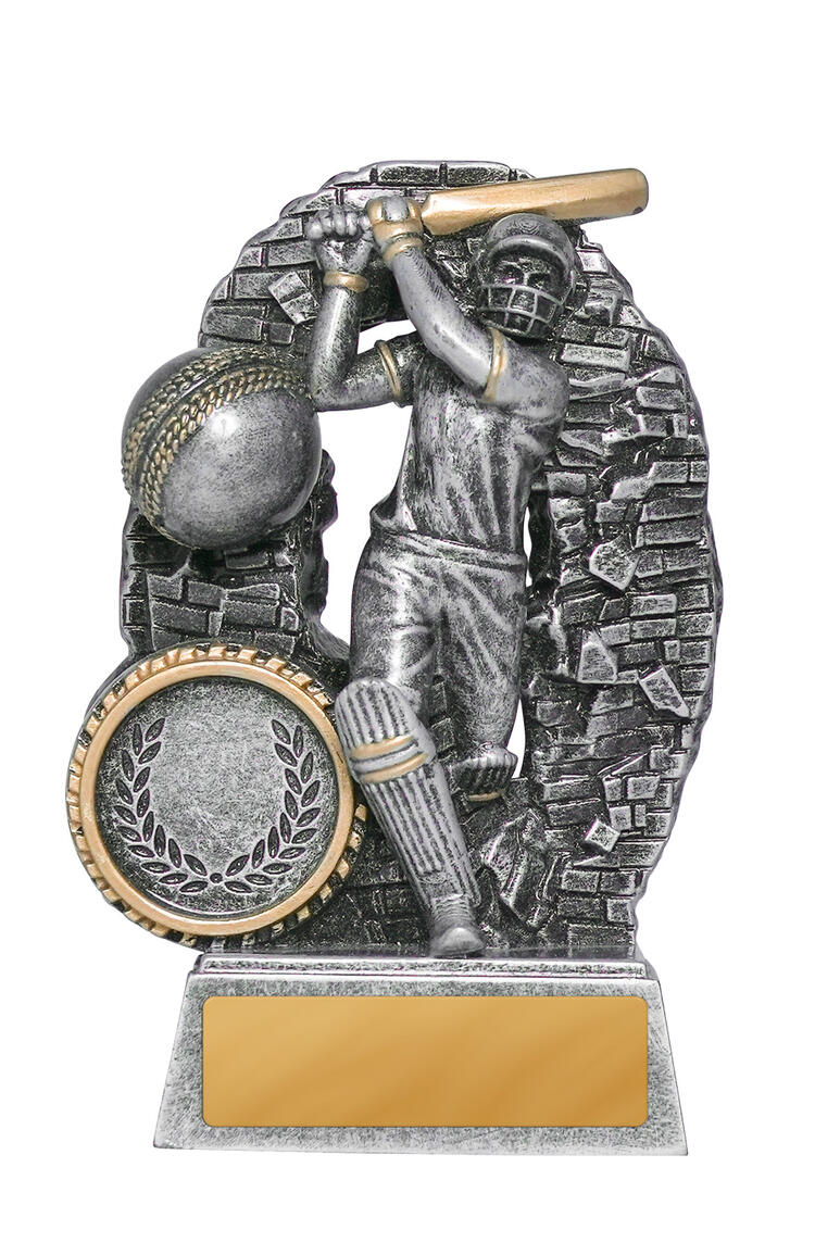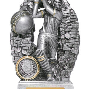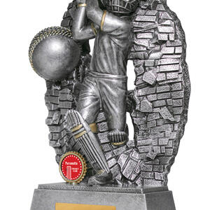 Showcasing dynamic movement, this cricket trophy from the Crash Through Series captures a male batsman in mid swing, surrounded by a detailed cricket ball and laurel wreath. Available in a durable silver and gold metallic finish in five sizes, it offers a premium and versatile solution for recognising cricket achievement with a professional edge.