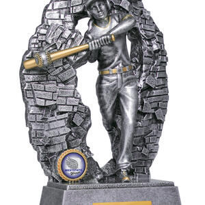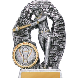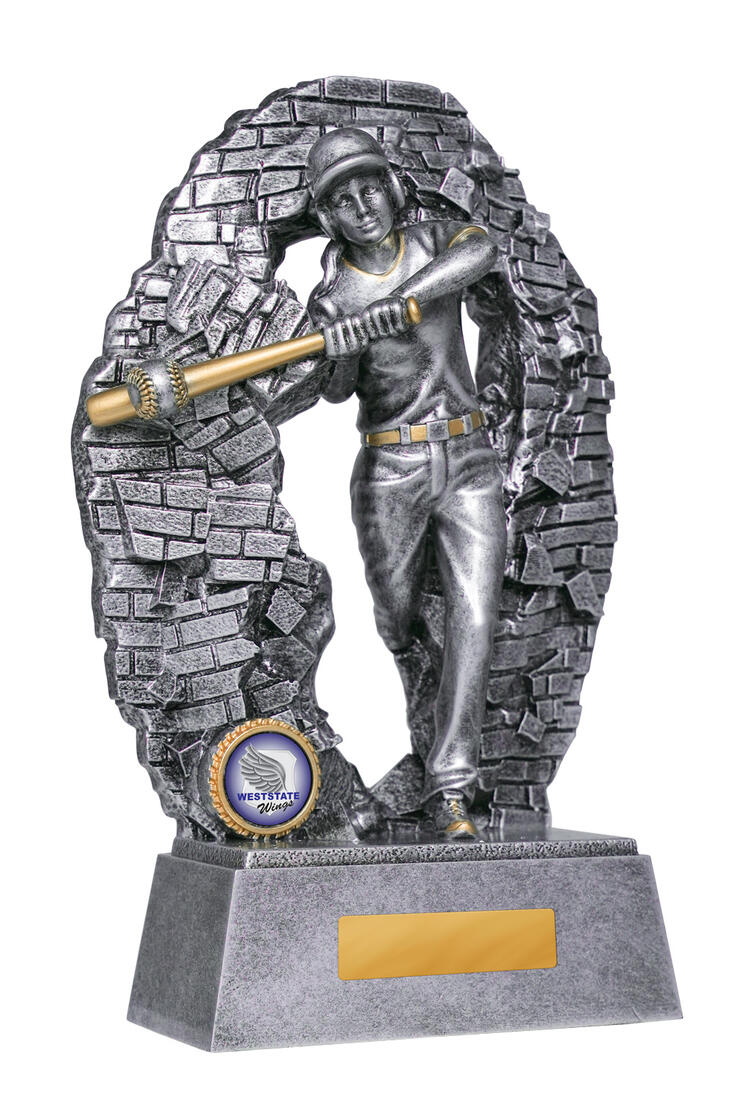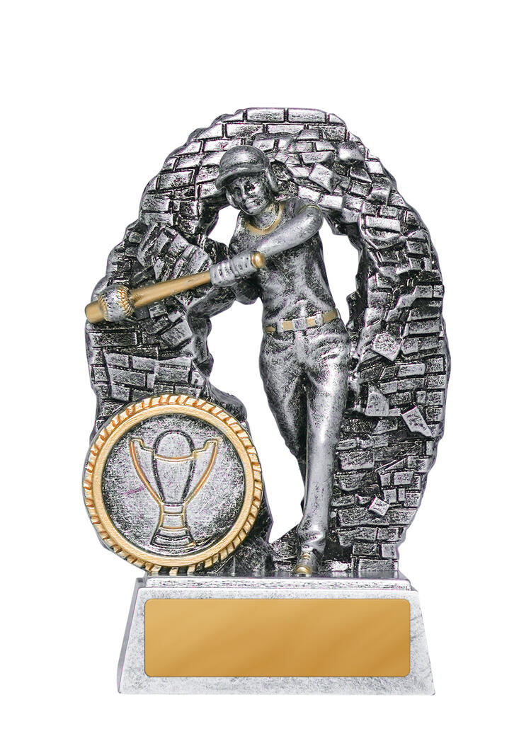 This baseball trophy celebrates outstanding female athletes with a bold design that commands attention. Featuring a dynamic batter preparing to swing, set against a textured brick wall backdrop, it is finished in refined silver and gold tones for a distinctive appearance. A circular emblem with a trophy motif completes this expertly crafted award, ideal for marking memorable achievements in baseball or softball.