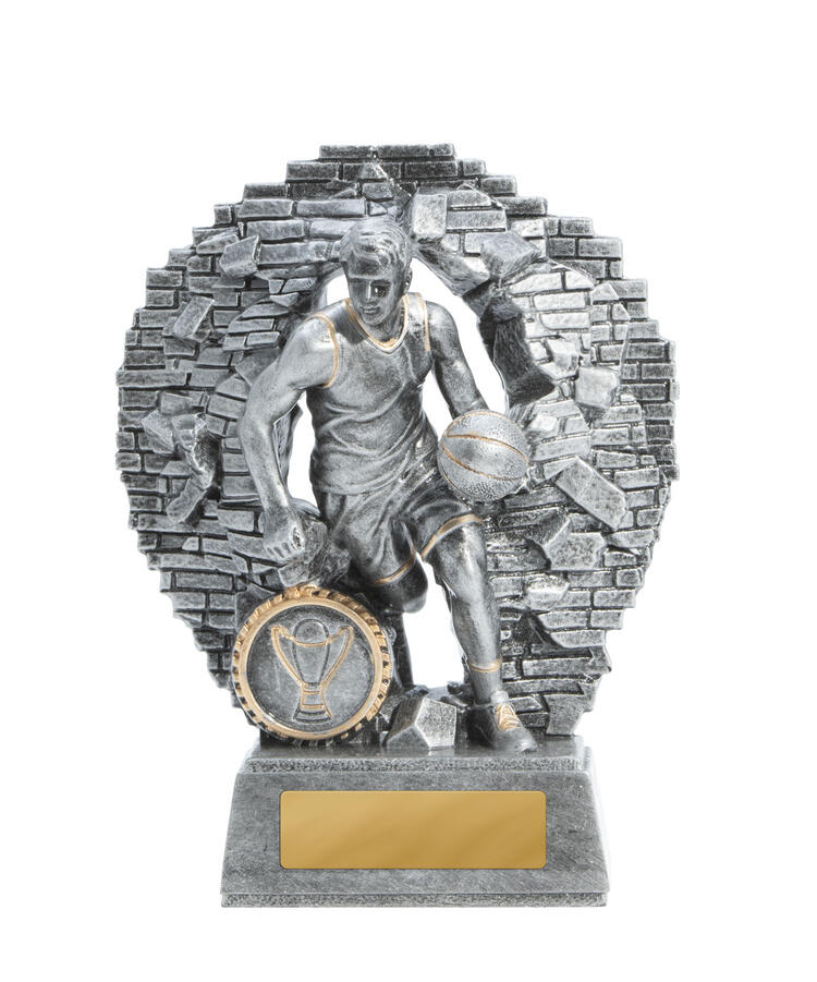 Celebrate sporting achievement with this basketball award, crafted to recognise determination and skill on the court. Featuring a male player in motion against a circular brick wall design, this trophy artfully symbolises breaking down barriers. It combines a strong, durable resin build with basketball and trophy emblem details for a memorable presentation.