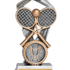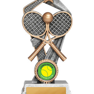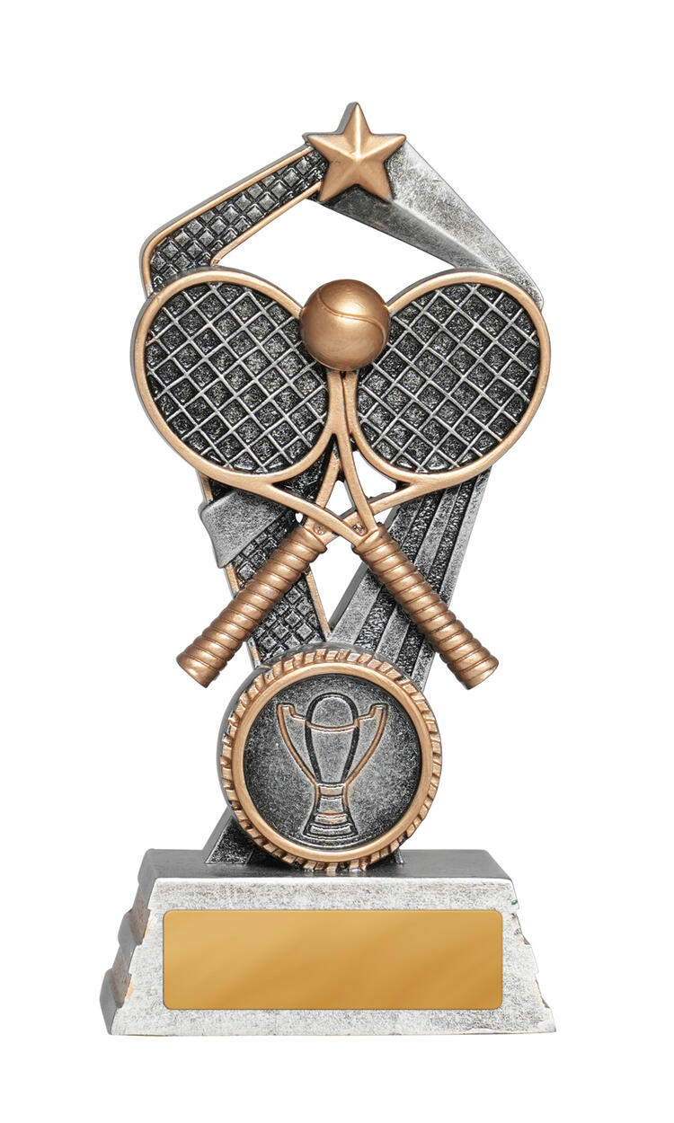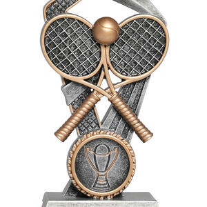 Showcasing a bold tennis motif with rackets, a ball, and a striking star element, this Santorini Series trophy stands out in any presentation. Available in a gold and silver finishes across three sizes, it is crafted from durable resin for a quality feel. Ideal for tennis trophies at club events or school competitions, its elegant design celebrates achievement with distinction.