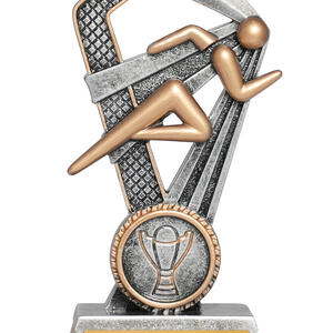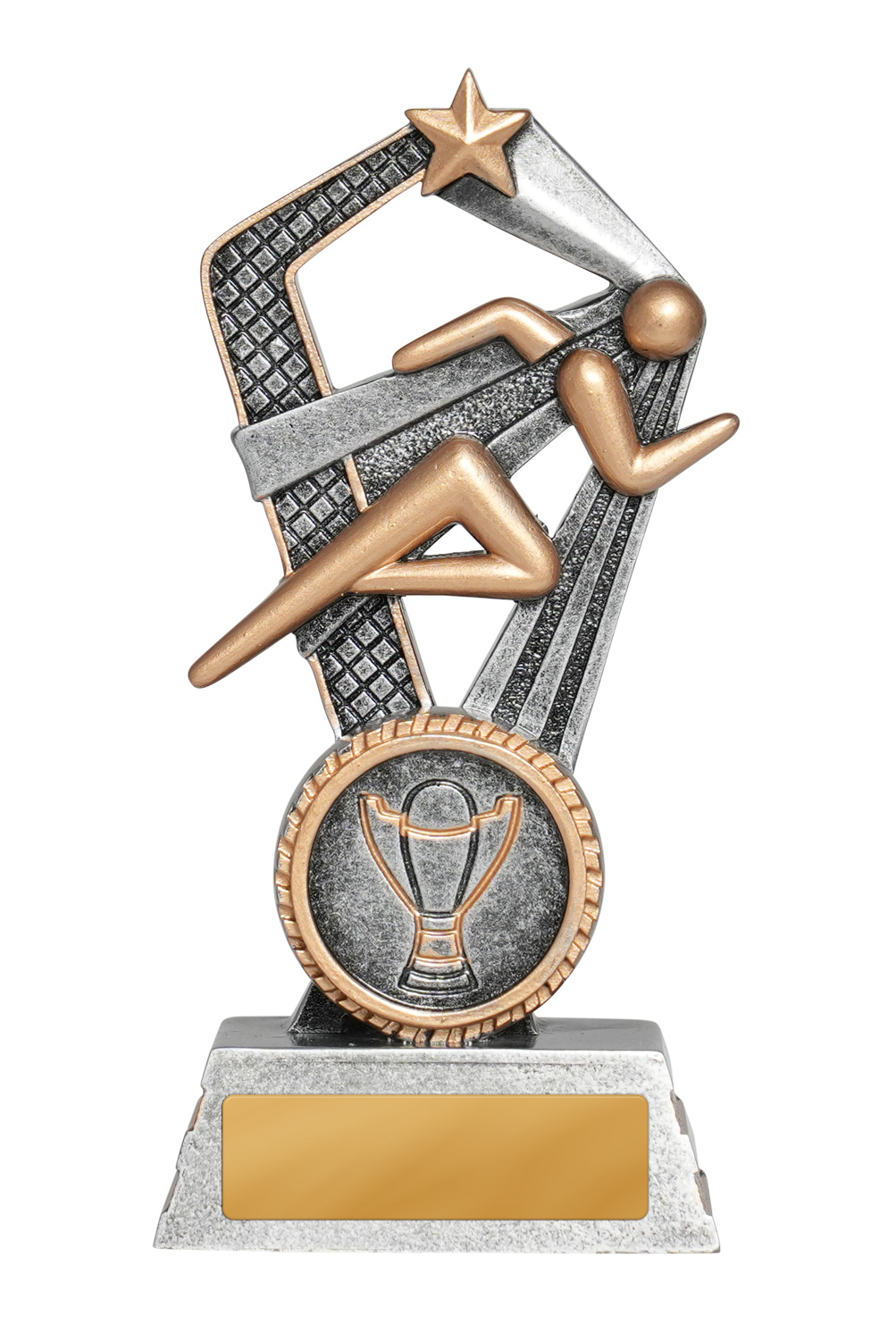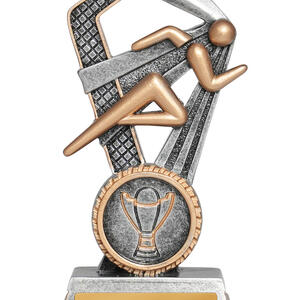 Celebrate athletic excellence with this Santorini Series athletics trophy, featuring a sleek running figure set alongside a bold star. Its striking cut out design and gold with silver finish make it a memorable piece for podium moments. Crafted from resin for durability, it includes a 25mm circular emblem area for personalised recognition at any athletics event.