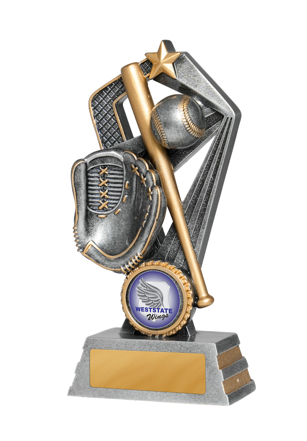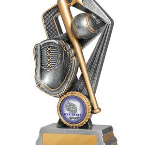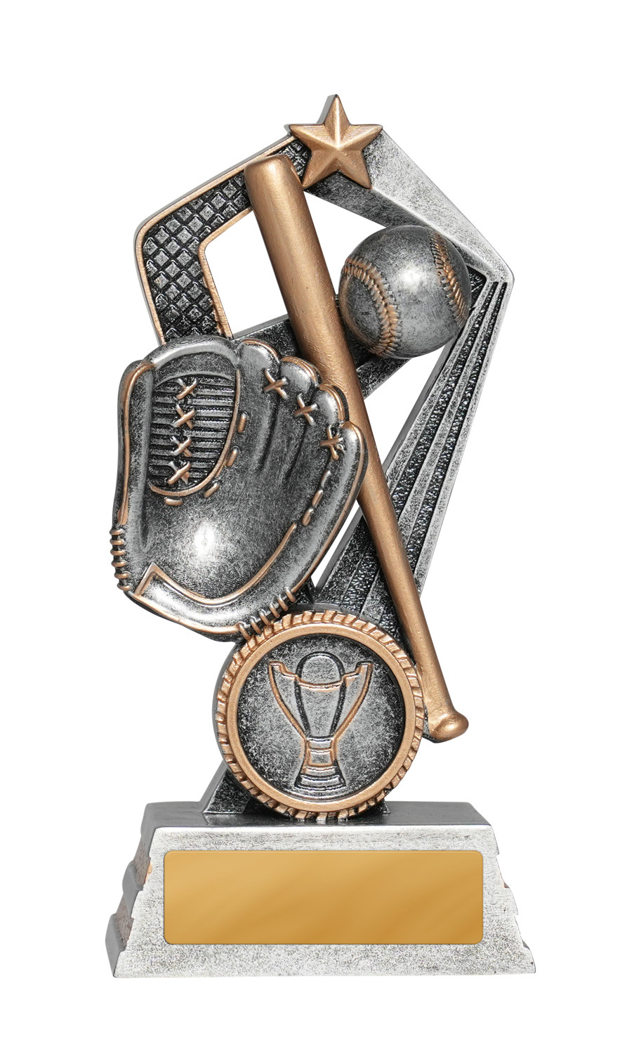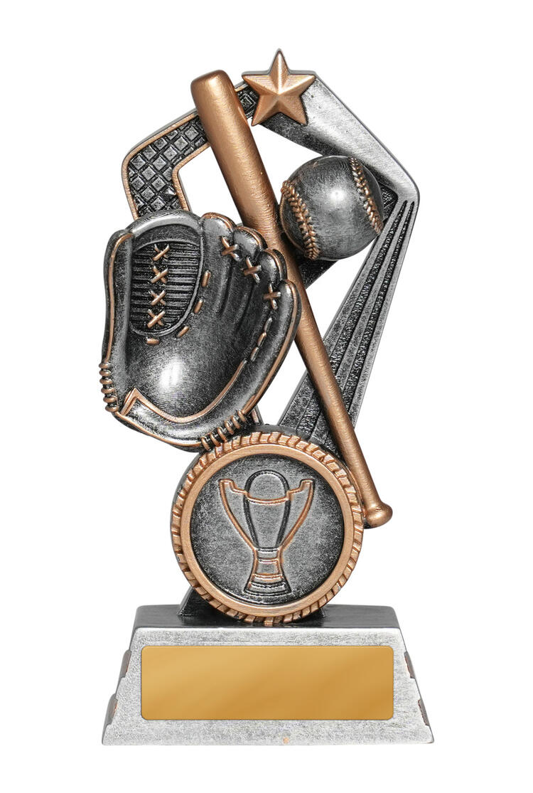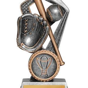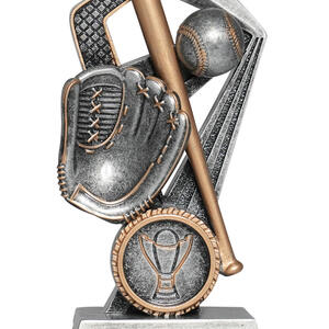 Celebrate achievement on the diamond with this baseball trophy from the Santorini Series. Crafted in silver and gold, it features a detailed baseball, bat, glove, and star design for a distinct, presentation. Durable resin construction, along with a traditional base, make this award a trusted option for recognising sporting excellence.