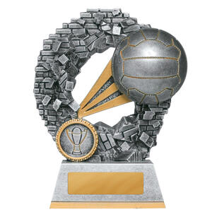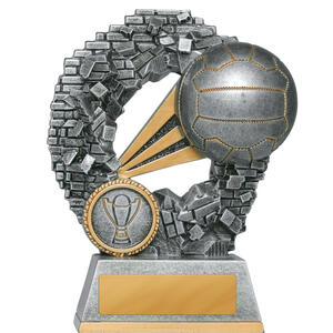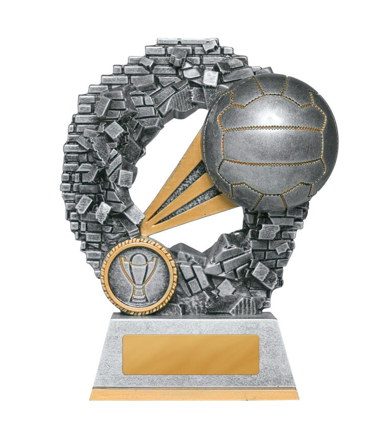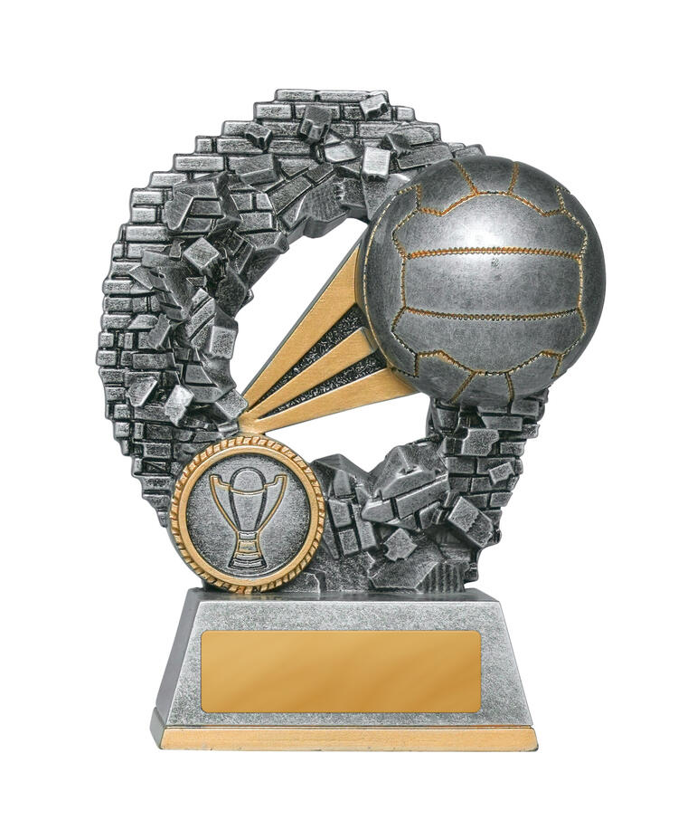 This contemporary netball trophy combines a striking silver finish with refined gold accents, making it a standout choice among netball trophies. A spherical top resembling a netball crowns the design, complemented by a laurel wreath motif and a flared base.