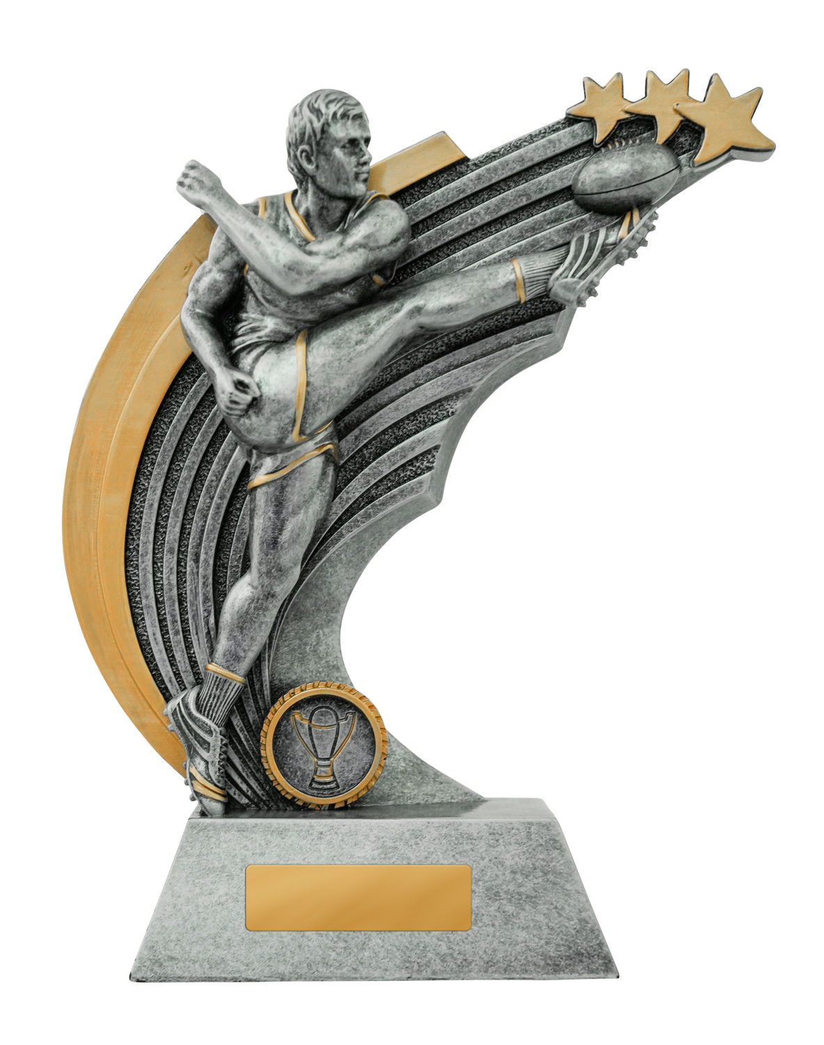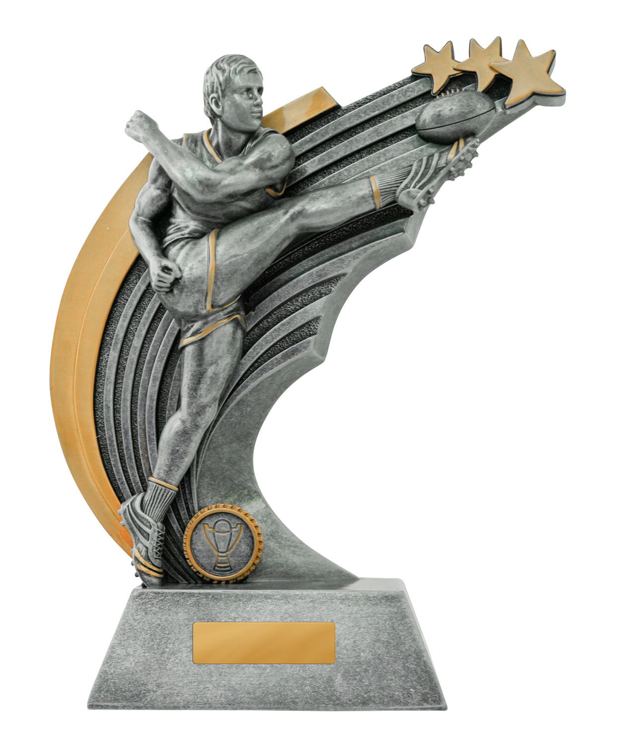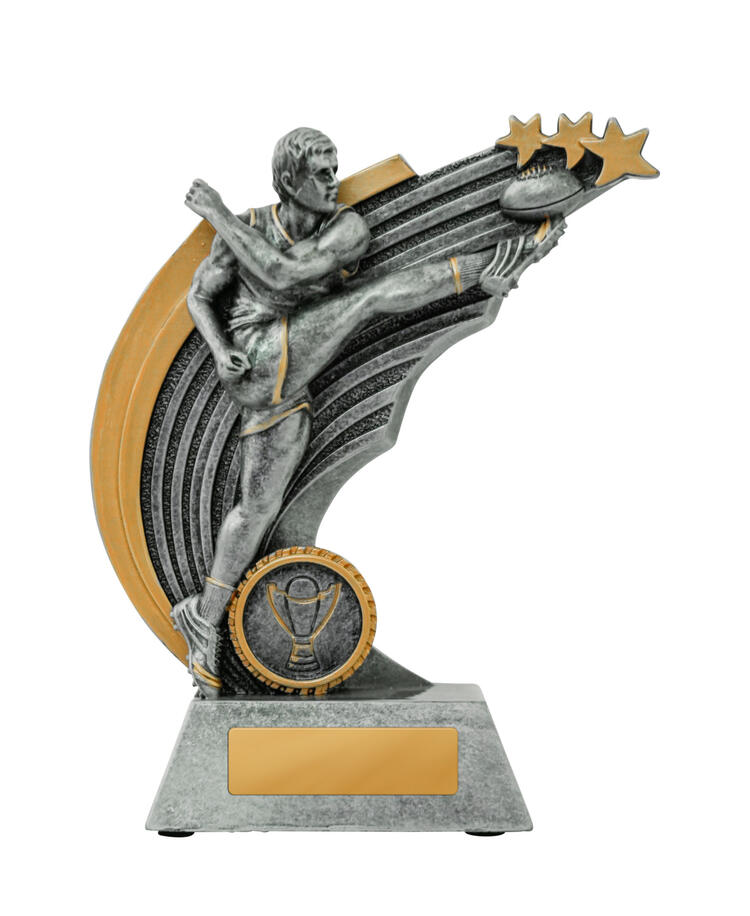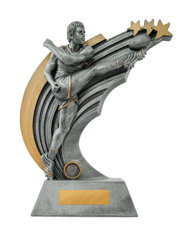 Celebrate achievement in Aussie Rules football with this elegantly crafted afl trophy. Featuring a dynamic male figure in mid kick against a striking starry backdrop, it combines antique silver and gold accents for a professional finish. The classic curved design and decorative base offer a memorable way to acknowledge skill.