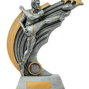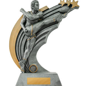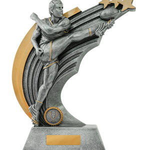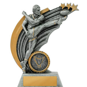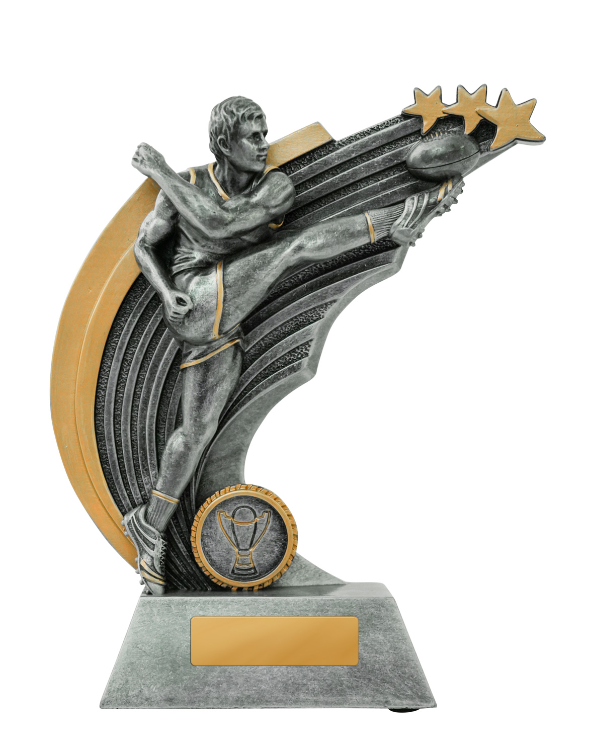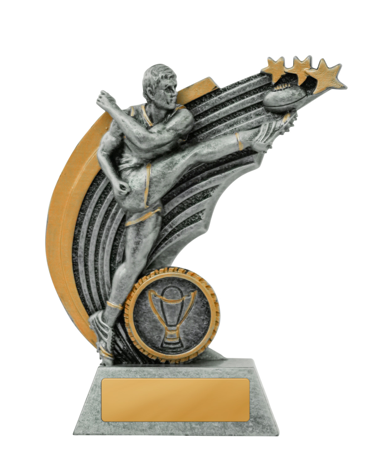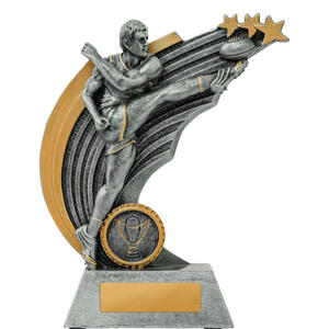 Celebrate achievement in Aussie Rules football with this elegantly crafted afl trophy. Featuring a dynamic male figure in mid kick against a striking starry backdrop, it combines antique silver and gold accents for a professional finish. The classic curved design and decorative base offer a memorable way to acknowledge skill.