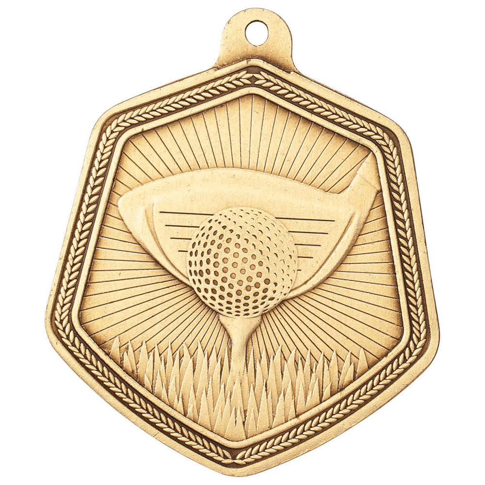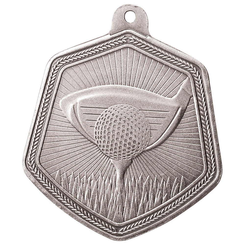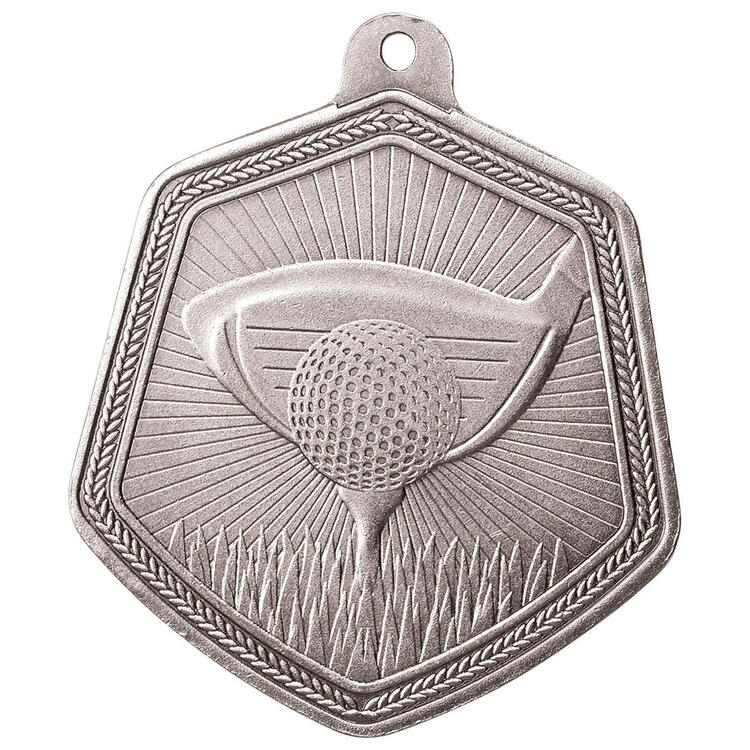 Designed for excellence in golf recognition, these Falcon Series golf medals showcase a striking hexagonal silhouette in your choice of gold or silver finish. The detailed motif presents a golf ball poised on a tee with a club in the background, framed by a decorative border for an elegant touch.