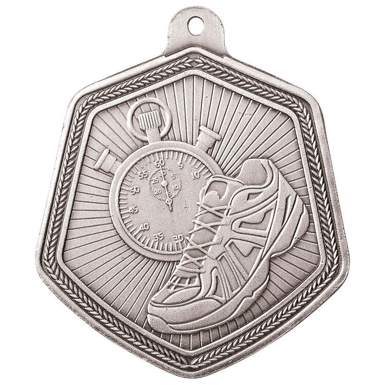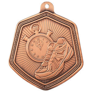 Celebrate achievement in athletics with these precision crafted pentagonal medals, offered in gold, silver, and bronze finishes. Each medal showcases embossed details of a stopwatch and running shoe, encapsulating the spirit of competition. A practical loop allows for easy attachment to a ribbon, making these athletics medals a trusted choice for sporting events and recognition ceremonies.