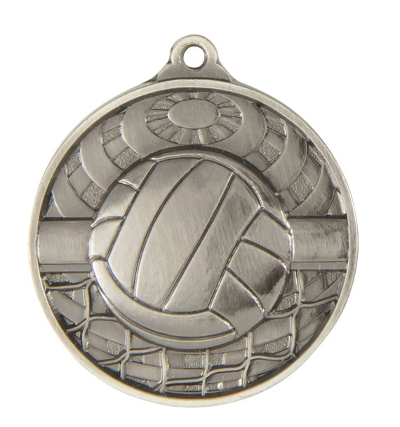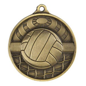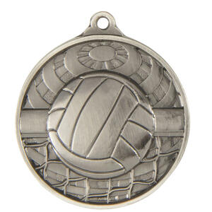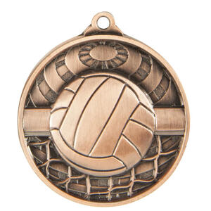 This volleyball medal is crafted from metal and features a detailed design with a ball and net motif set within a 50mm circular frame. Available in gold, silver or bronze, it includes a loop for attaching ribbons in your chosen colour.