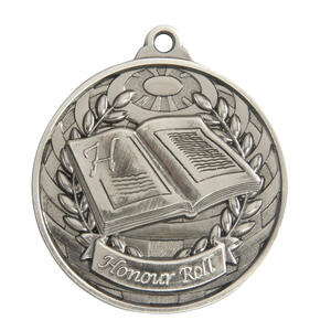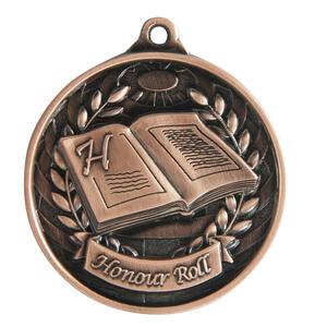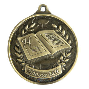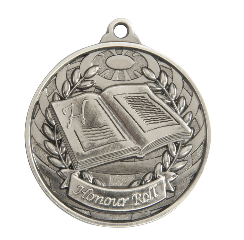 This 50mm Global Medal Honour Roll features a refined circular design, available in gold, silver, or bronze finishes. The embossed open book, laurel wreath, and 'Honour Roll' details create a professional and dignified tribute to academic accomplishment. Purpose built as education medals, these awards are ideal for recognising outstanding achievement in schools, colleges, or academic programmes.