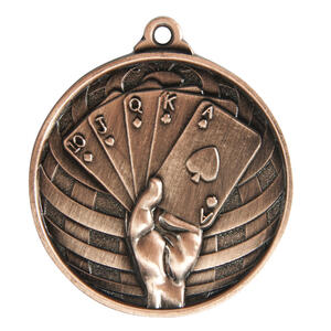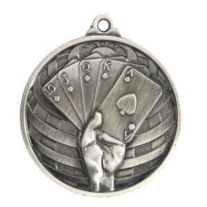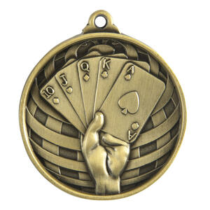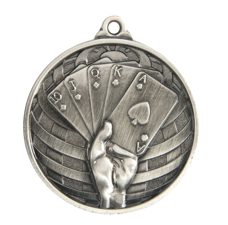 This refined 50mm circular medal is crafted from metal and available in gold, silver and bronze finishes, offering a premium solution for recognising achievement in card games. The front displays a striking hand holding a royal flush, enhanced by a textured background for added depth and elegance.