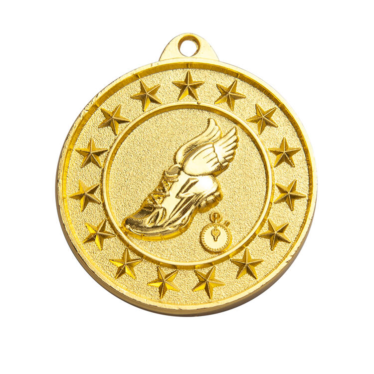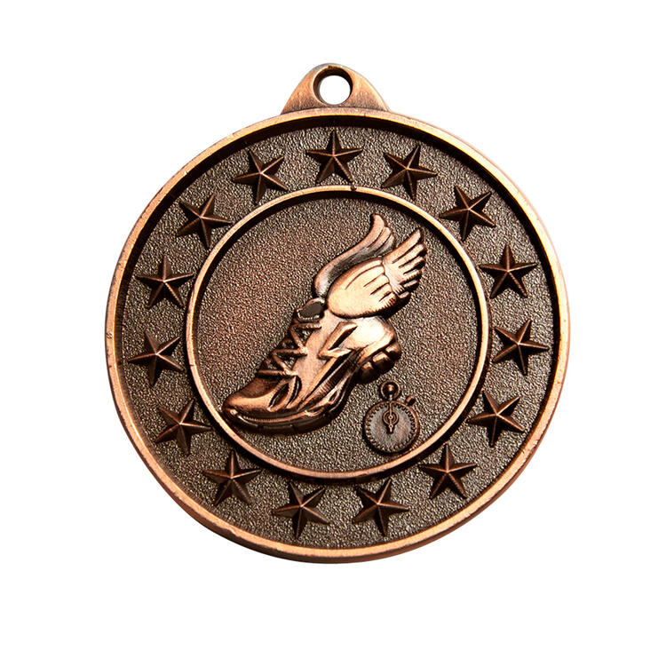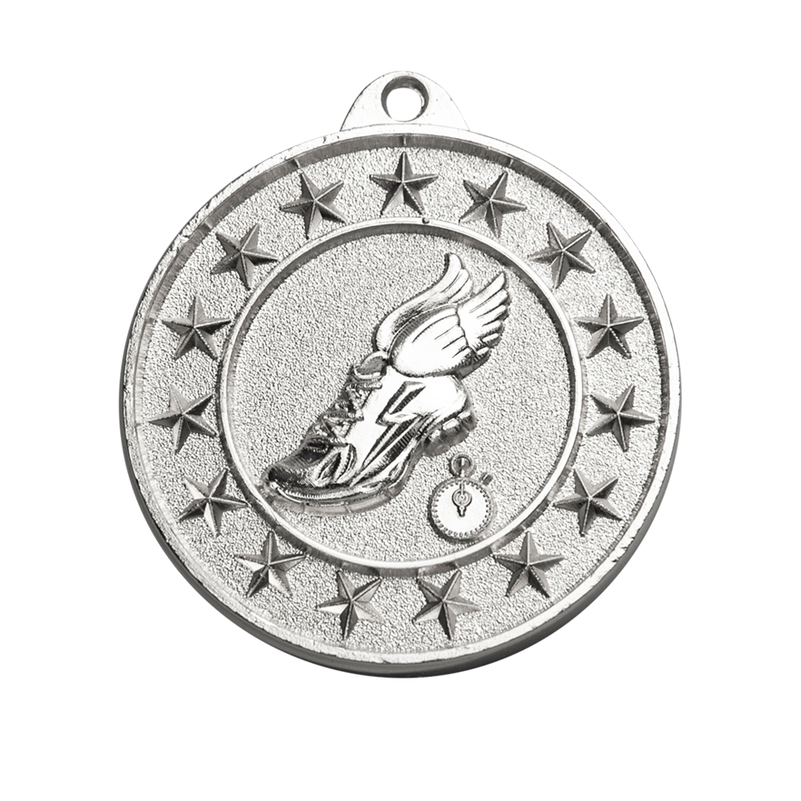 Celebrate performance with this circular athletics medal, expertly crafted in metal and finished in your choice of antique gold, silver or bronze. The detailed design features a winged shoe and stopwatch surrounded by stars, symbolising achievement in running and track events. As part of the Sunraysia Medal series, it offers a classic, professional recognition solution for athletics medals.