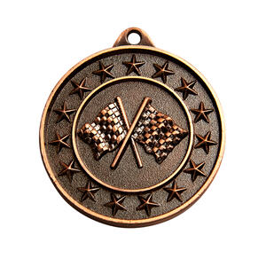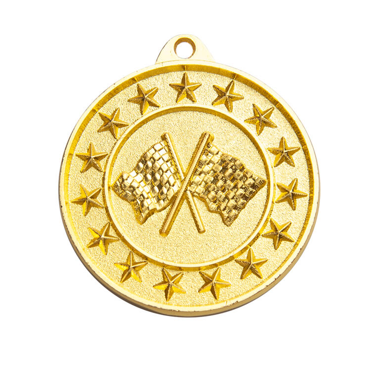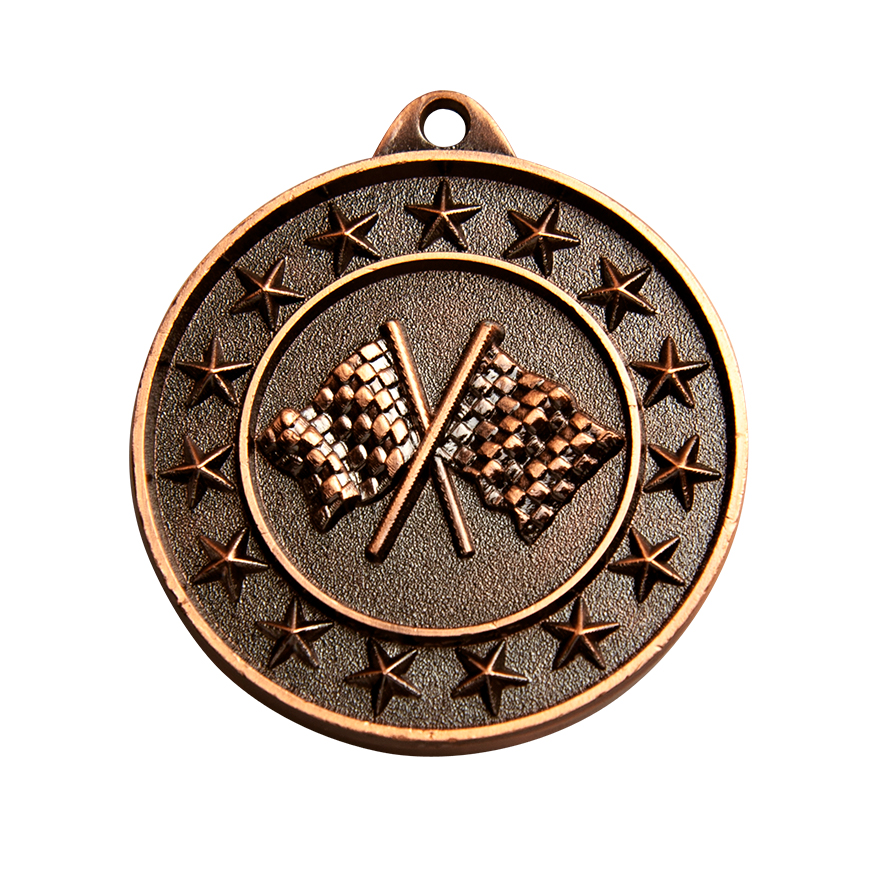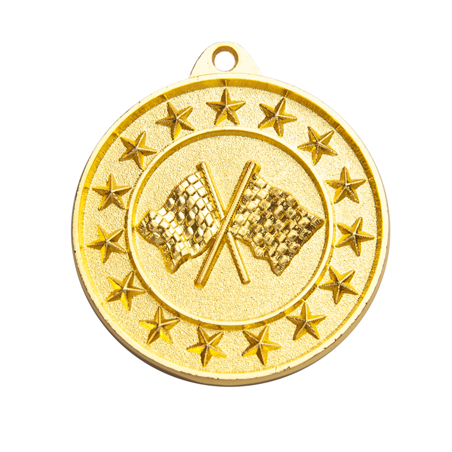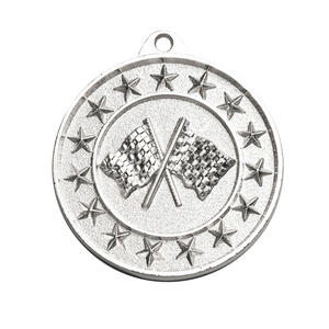 This circular medal is crafted for motorsport achievement, offering gold, silver or bronze, colour options for tailored recognition. Its design features crossed checkered flags surrounded by a border of stars, delivering a bold and relevant symbol of accomplishment. A practical loop allows for secure attachment, making these motorsport medals a fitting choice for award ceremonies and special events.
