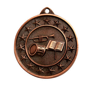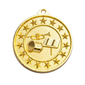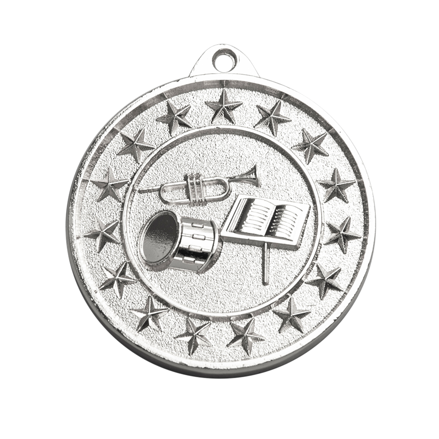 This music medal combines metal construction with an inspiring musical motif, making it a distinguished choice for recognising achievement in the performing arts. Available in gold, silver, and bronze finishes, the circular design showcases embossed details of a trumpet, drum, and music stand, all framed by a band of stars. Its integrated loop ensures secure attachment with a ribbon for display.