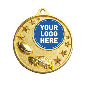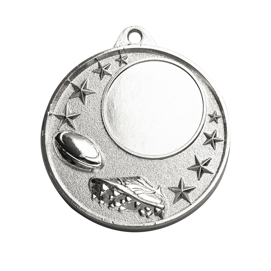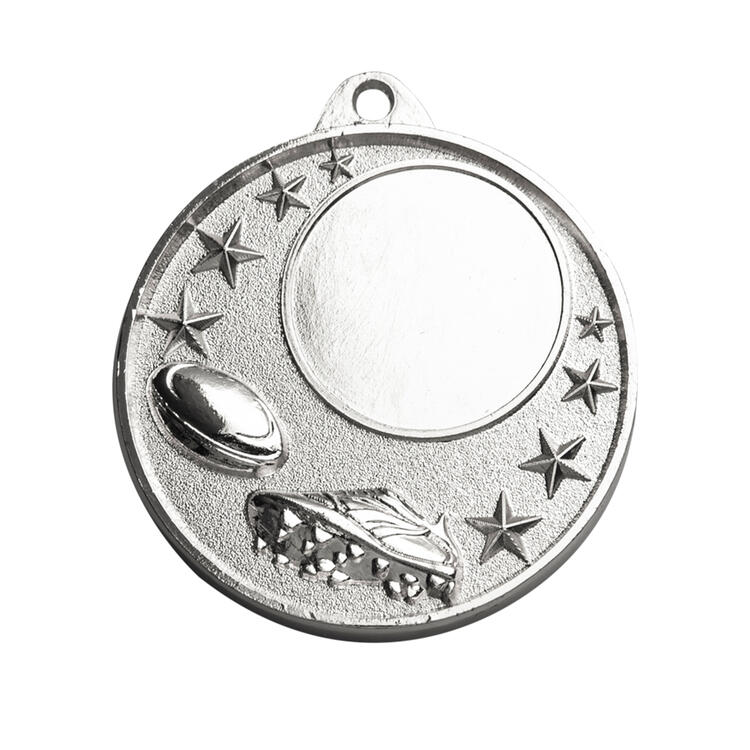 This rugby medal from the Shooting Star Series presents a sophisticated choice for sporting recognition. Crafted from metal and available in gold, silver, and bronze finishes, its circular 50mm design features refined embossed elements of a rugby ball and cleat encircled by a star motif. A central blank area allows for customisation, making these rugby medals both distinctive and versatile for award ceremonies.