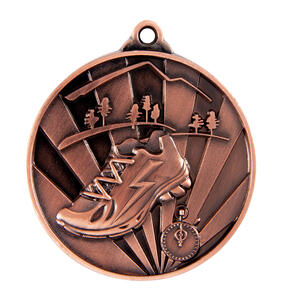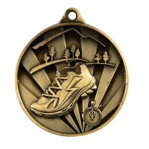 Celebrate achievement with this cross country medal, crafted from metal in a choice of gold, silver, or bronze finishes. The circular design showcases a detailed running shoe set against a backdrop of trees, mountains, and a stopwatch, perfectly capturing the essence of cross country competition. A practical loop ensures effortless attachment or a ribbon for any ceremony or event.