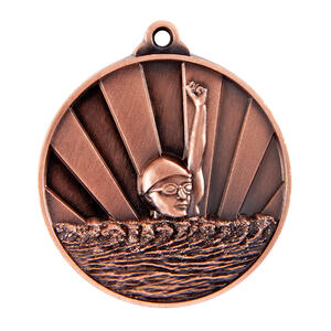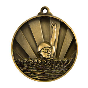 This 50mm swimming medal delivers a distinguished mark of achievement, crafted from metal and showcased in gols, silver or bronze finishes. Its circular design features a swimmer in motion, highlighted by detailed water waves and a striking sunburst backdrop. Ideal for presentations, this piece combines elegance and athletic energy in a celebratory and professional award.