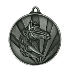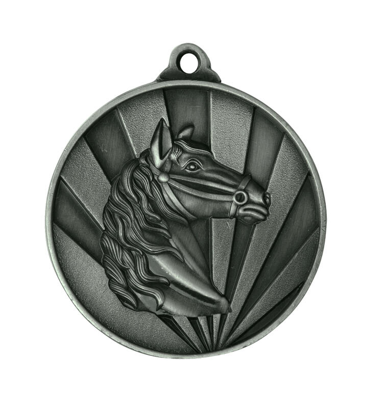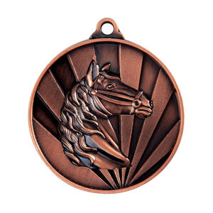 Celebrate equestrian achievement with this finely crafted medal, featuring a striking horse head set against a radiant sunburst background. Available in gold, silver, and bronze finishes, its classic circular design with a convenient top loop offers versatile display options. An ideal choice for equestrian medals, this award brings quality and distinction to any horse sport event.