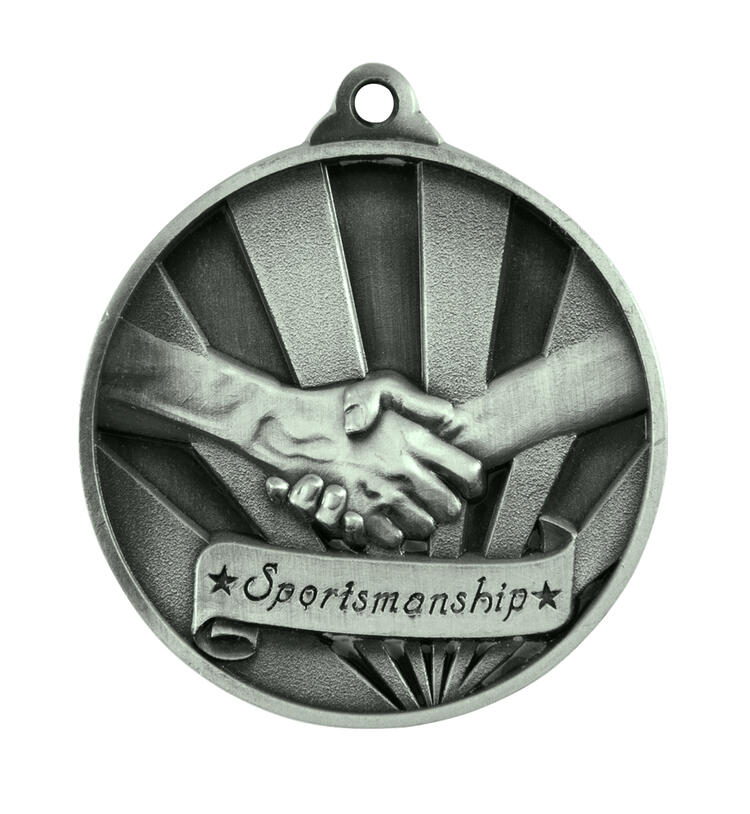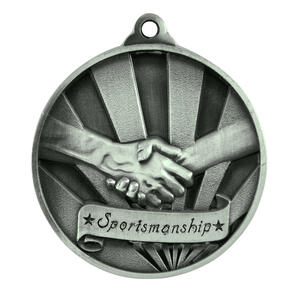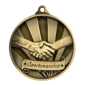 Celebrate the spirit of fair play with this 50mm Sunrise sports medal, crafted from metal in your choice of gold, silver, or bronze finish. Its circular design features a classic handshake motif and 'Sportsmanship' banner, making it an elegant choice for recognising teamwork and integrity across any sporting event.