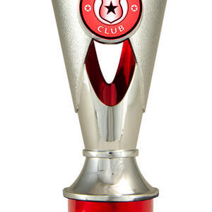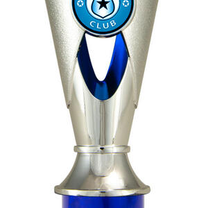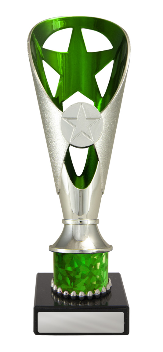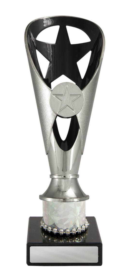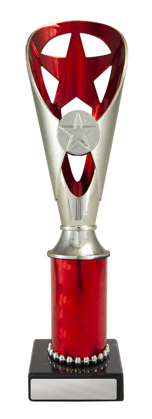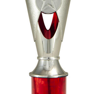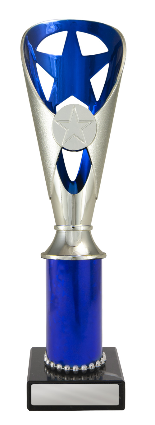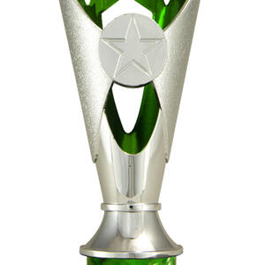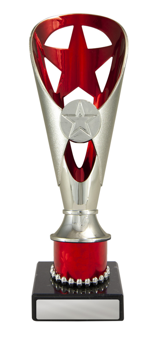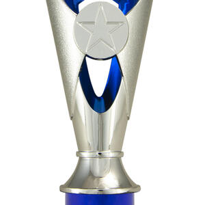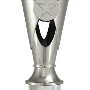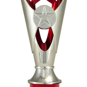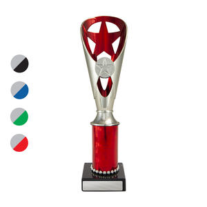 A versatile budget trophy cup for all sporting occasions, this design features a sleek base with a flared top and a distinctive star motif. The trophy is available in silver and black, red, green, or blue, with a base that adds a polished touch. Durable metal and plastic construction and five size options ensure a professional and reliable solution for recognising achievement in any setting.