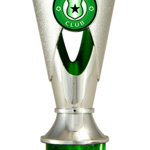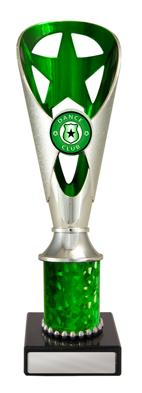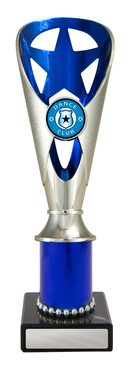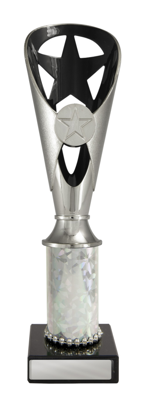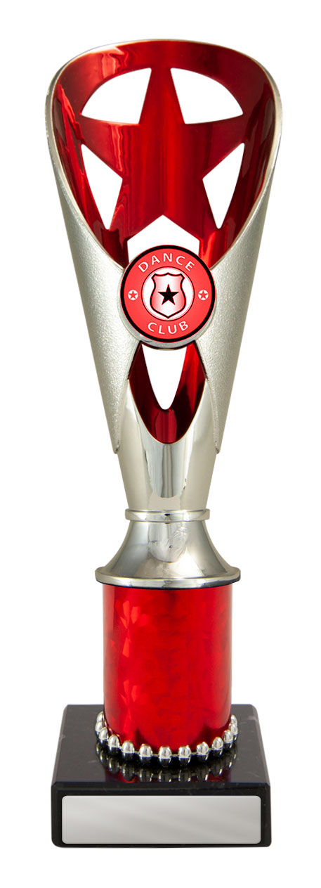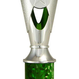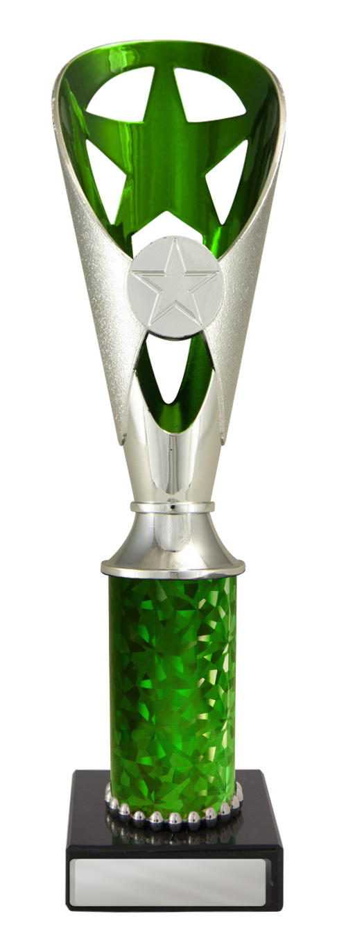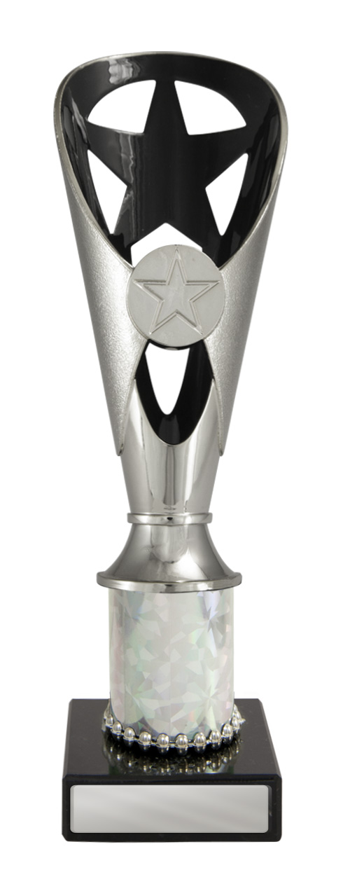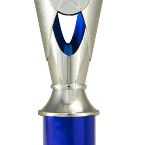 A versatile budget trophy cup for all sporting occasions, this design features a sleek base with a flared top and a distinctive star motif. The trophy is available in silver and black, red, green, or blue, with a base that adds a polished touch. Durable metal and plastic construction and five size options ensure a professional and reliable solution for recognising achievement in any setting.
