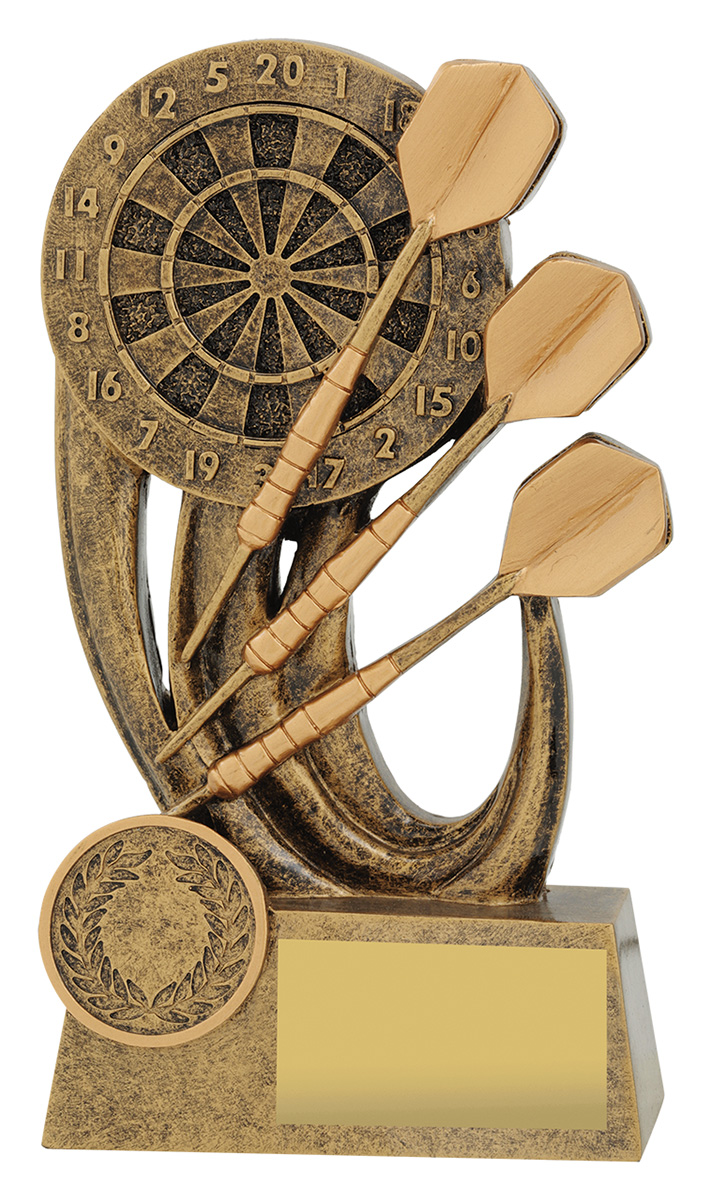 Celebrate darts achievement with this expertly crafted darts trophy, distinguished by its gold metallic finish. The design features a prominent dartboard, three finely detailed darts, and a laurel wreath emblem, capturing the spirit of precision and competition. Durable resin ensures longevity, while a classic silhouette create a professional, memorable award for standout performance.