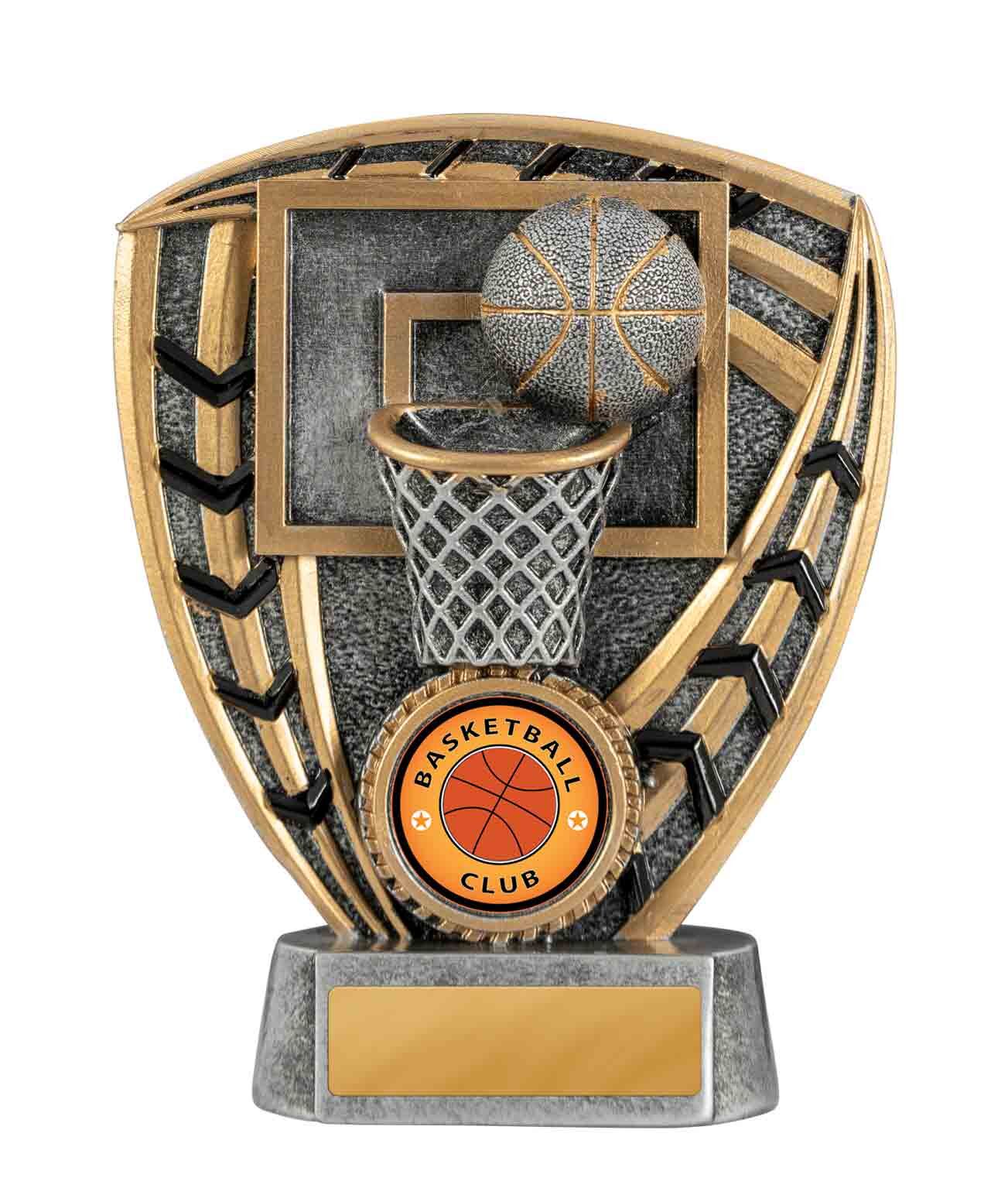 Resin basketball trophy featuring a hoop and backboard design in silver and gold. Complete with a textured finish and club logo insert, this compact award is perfect for recognising participation and effort across all levels of basketball.