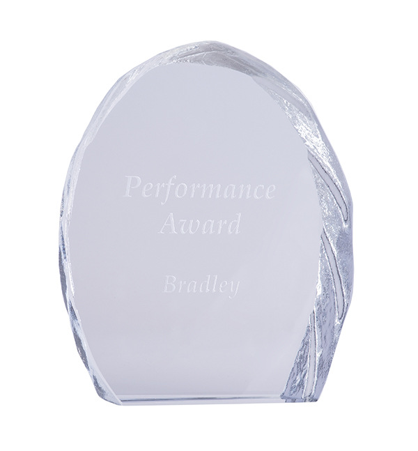 Glass trophies typically have a very slight green tinge, which can subtly affect the appearance of colour printing. In contrast, crystal trophies are completely clear.