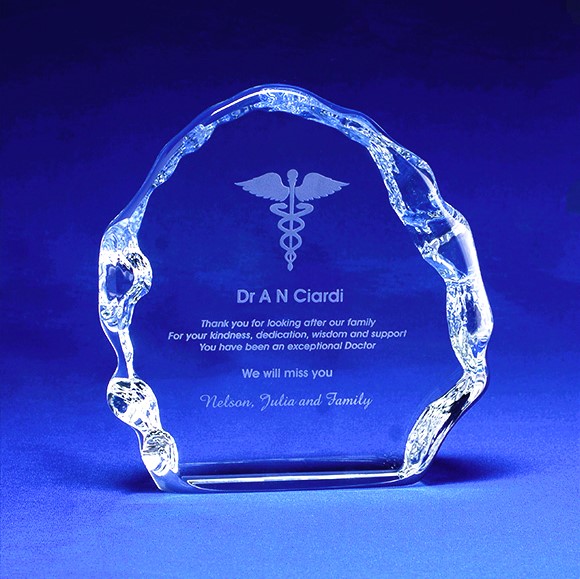 Glass trophies typically have a very slight green tinge, which can subtly affect the appearance of colour printing. In contrast, crystal trophies are completely clear.