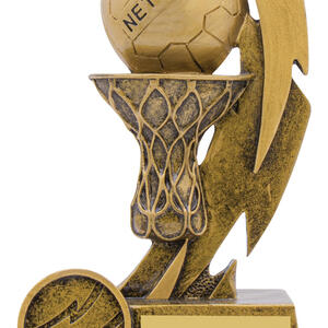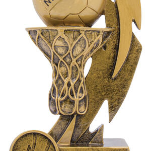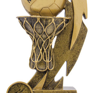 This netball trophy captures the dynamic spirit of the game with its bold gold finish. Showcasing a netball poised above a net and accented by a lightning bolt motif, it stands out for both its contemporary design and durable resin construction. The rectangular base with a circular emblem adds a professional, celebratory touch to this memorable award.