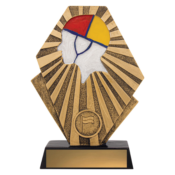 This radiant surf life saving trophy features a coloured cap silhouette set against gold rayburst detailing. Crafted from durable resin, its a vibrant and distinctive award ideal for recognising surf club achievements.