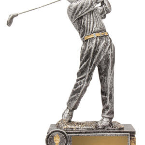 This detailed resin trophy captures a golfer mid-swing, complete with realistic texture and antique silver finish. Mounted on a black base with a gold name plate, its a sophisticated award for golf tournaments or club presentations.