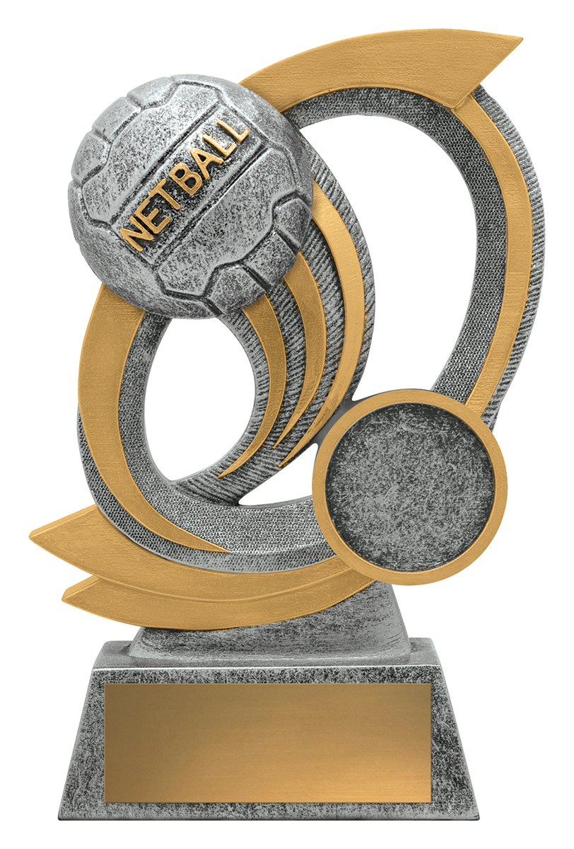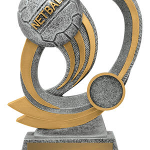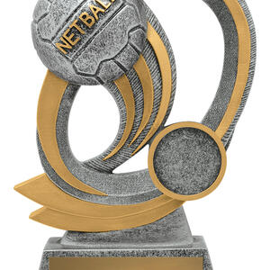 This abstract netball trophy features elegant gold and silver tones, crafted from premium resin for a contemporary presentation. Curved elements rise from a circular base, centring on a striking netball motif and the word 'Netball' as part of the design, making it an ideal choice for memorable netball awards.