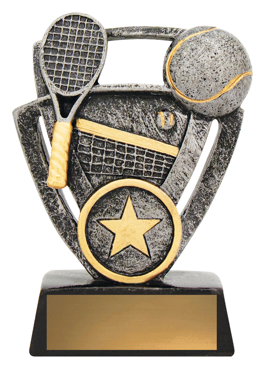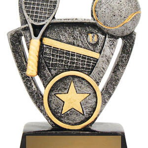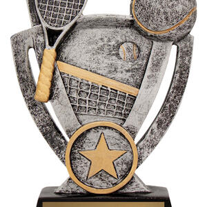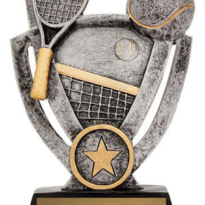 Celebrate sporting achievement with this tennis themed trophy, crafted in durable resin and finished in a contemporary blend of silver, gold, and black. The detailed design highlights a tennis racket, ball, and net, complemented by a star emblem at the base for a memorable touch. An ideal choice for those seeking quality tennis trophies that balance elegance and value.