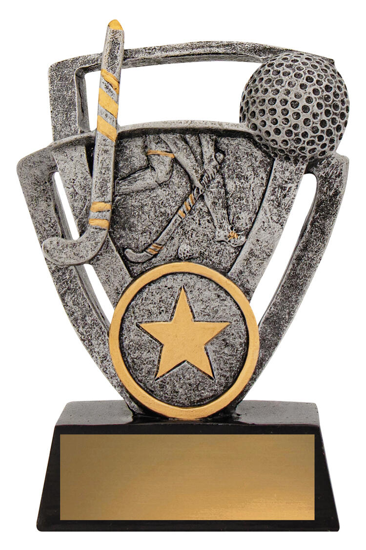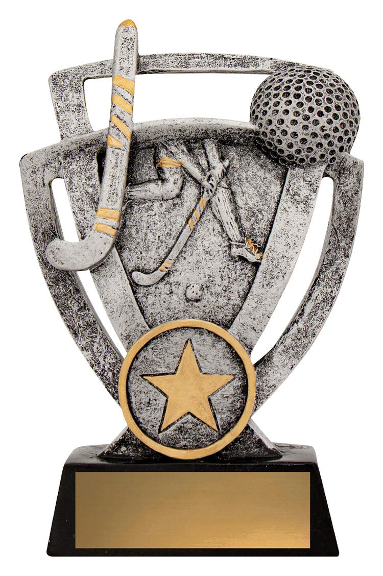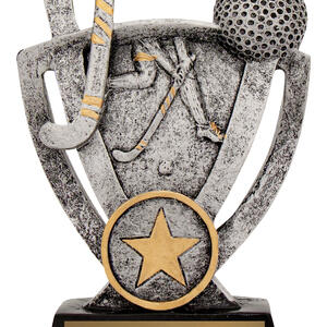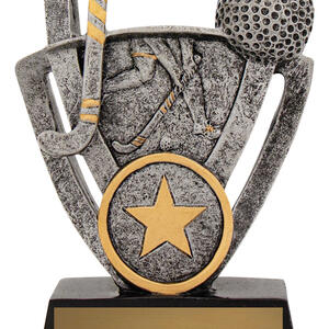 Celebrate dedication and sportsmanship with this hockey trophy, crafted in a harmonious blend of silver, gold, and black. The trophy features a striking hockey stick and ball motif, complemented by a star emblem at the base that signifies achievement. Constructed from durable resin, it provides a reliable and elegant solution for memorable hockey recognition.