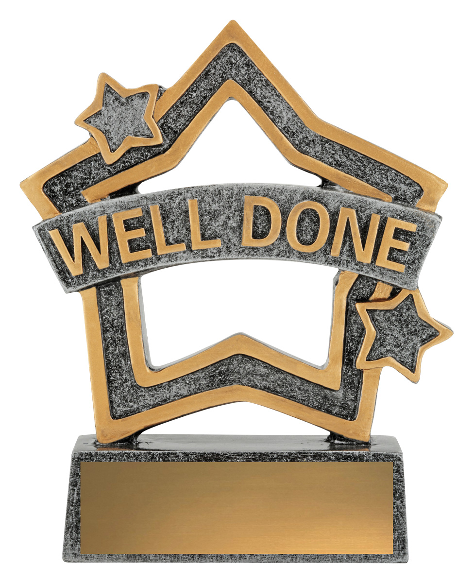 This cheerful star shaped trophy with “WELL DONE” banner design is perfect for recognising effort and participation. Finished in antique silver and gold tones, it’s a fun award for schools and clubs.