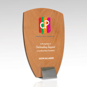 This contemporary bamboo timber trophy features a smooth natural finish and vibrant full colour digital print, allowing logos and text to stand out with exceptional clarity. Crafted from sustainable bamboo and mounted on a curved brushed metal base, it offers a modern presentation with an eco-conscious edge perfect for corporate awards, recognition programs, or sustainability-focused events.