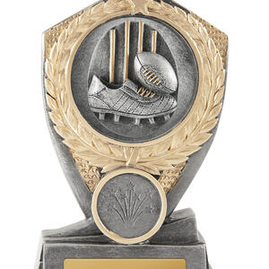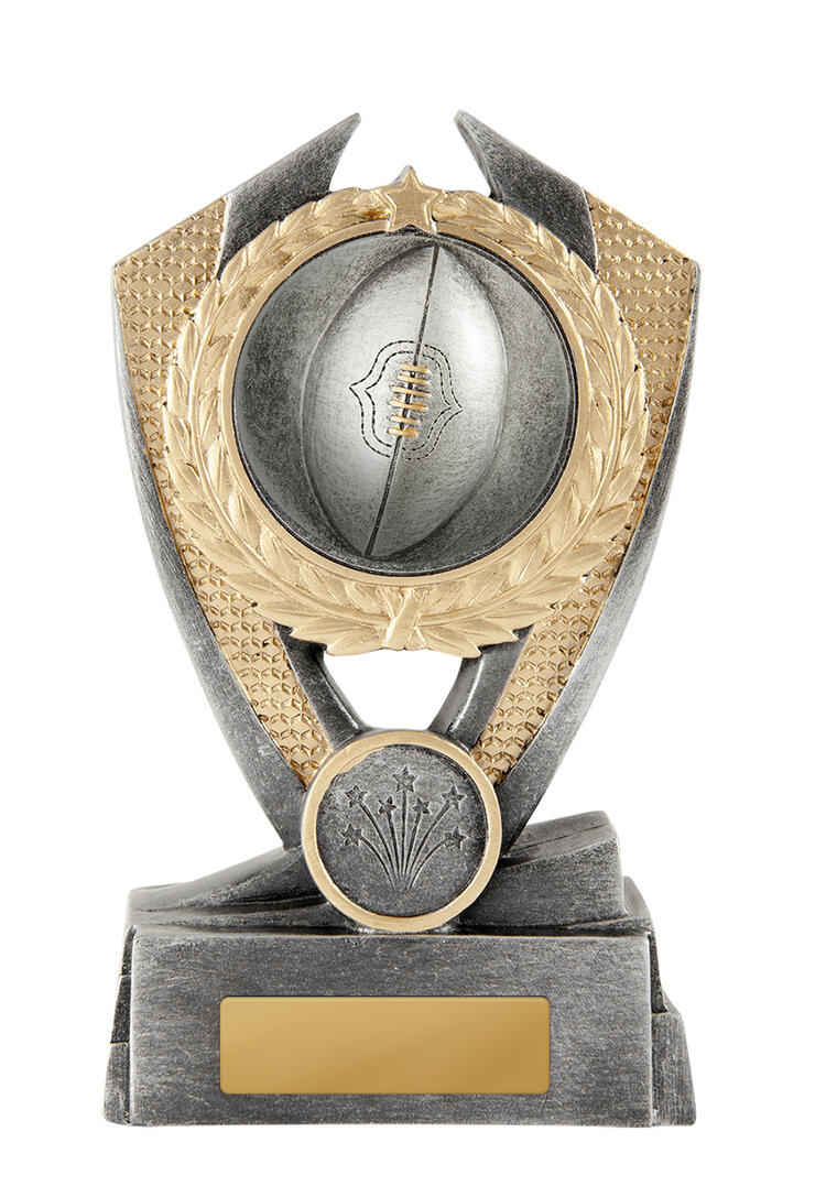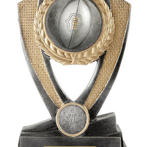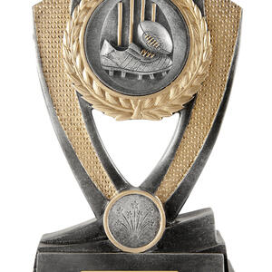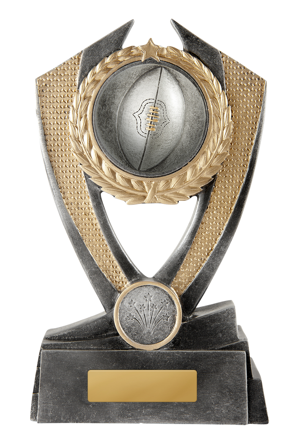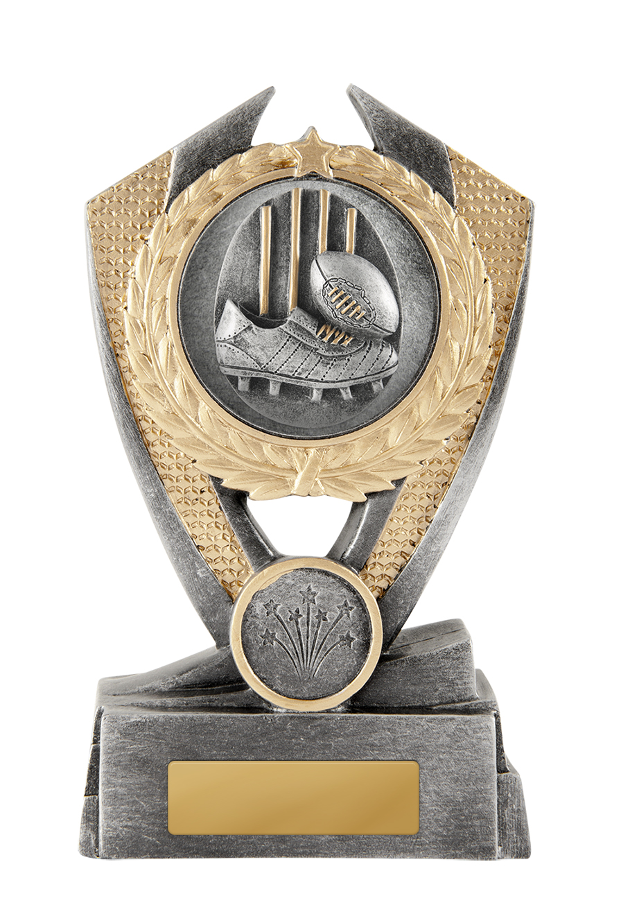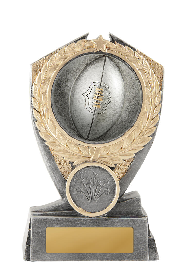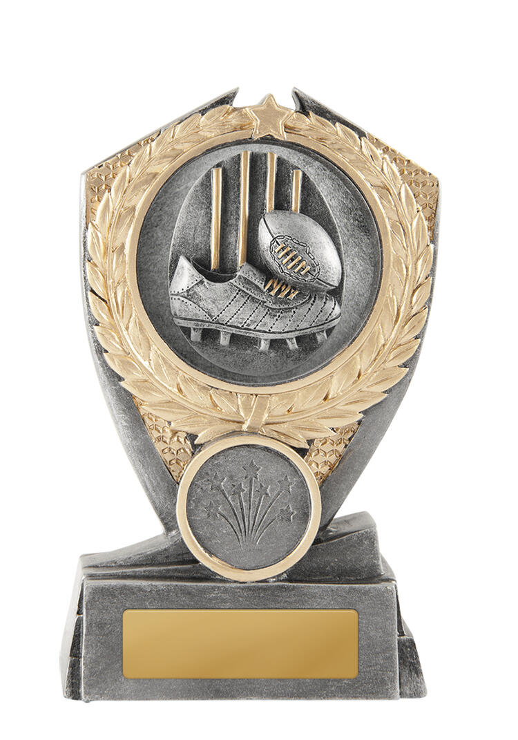 Celebrate achievement on the field with this aussie rules trophy, crafted to honour excellence in Aussie Rules football. The shield shaped design features an antique gold, silver, and grey finish, highlighted by a laurel wreath, football, and boot motif.