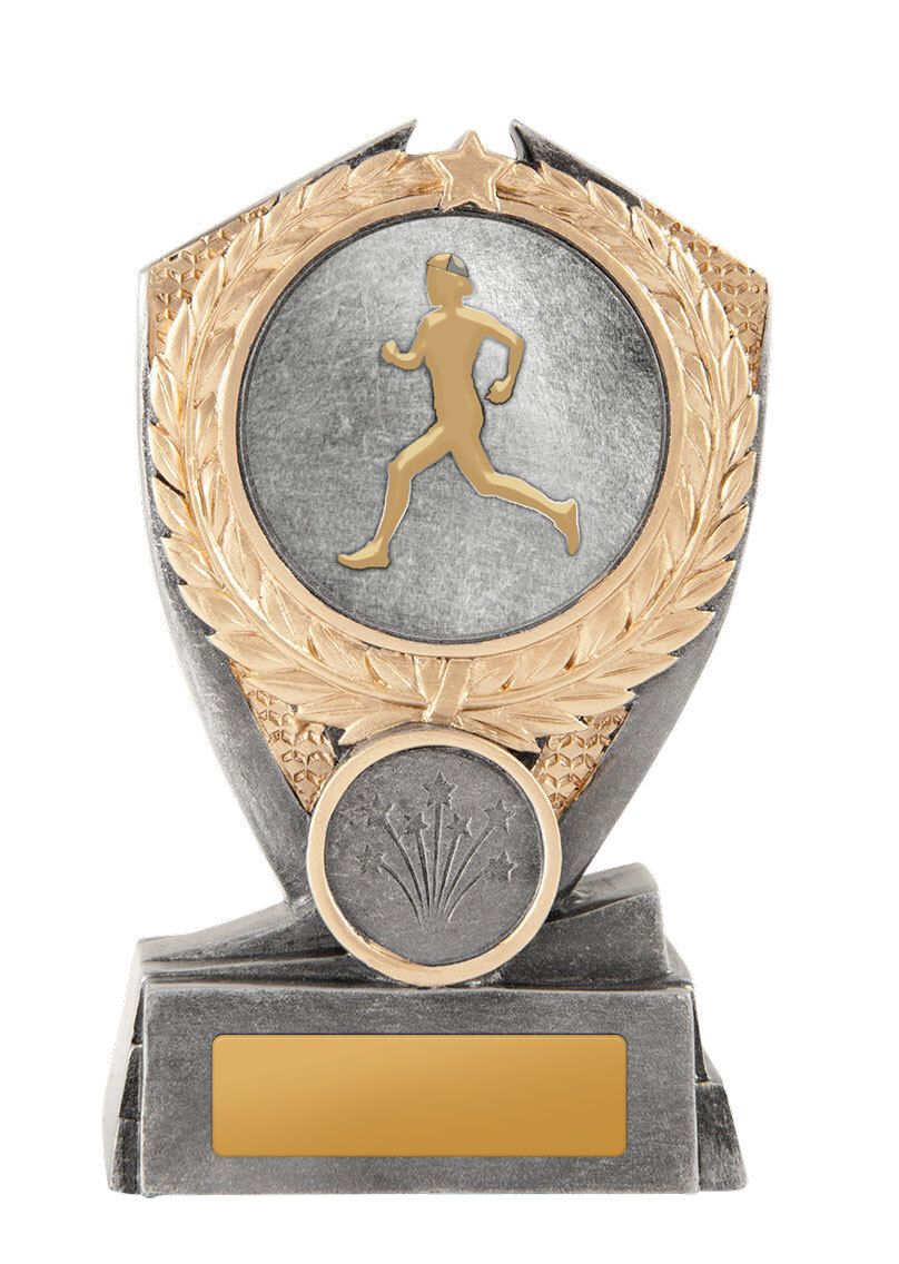 This silver and gold resin life saving trophy features a raised runner figure framed by a detailed laurel wreath and star accent. With a textured silver backdrop and gold trim, itÂ’s a stylish choice for all awards.