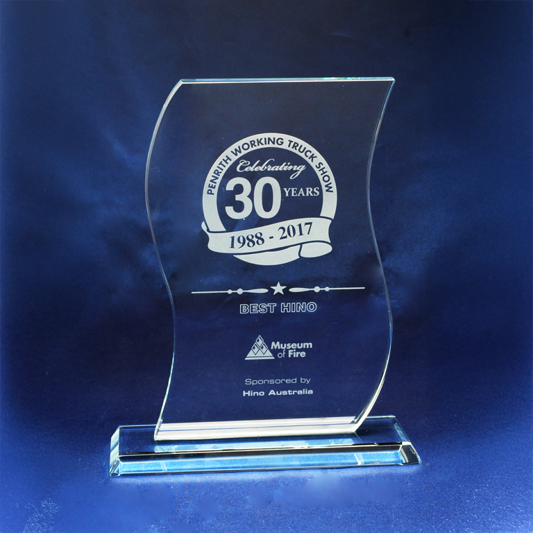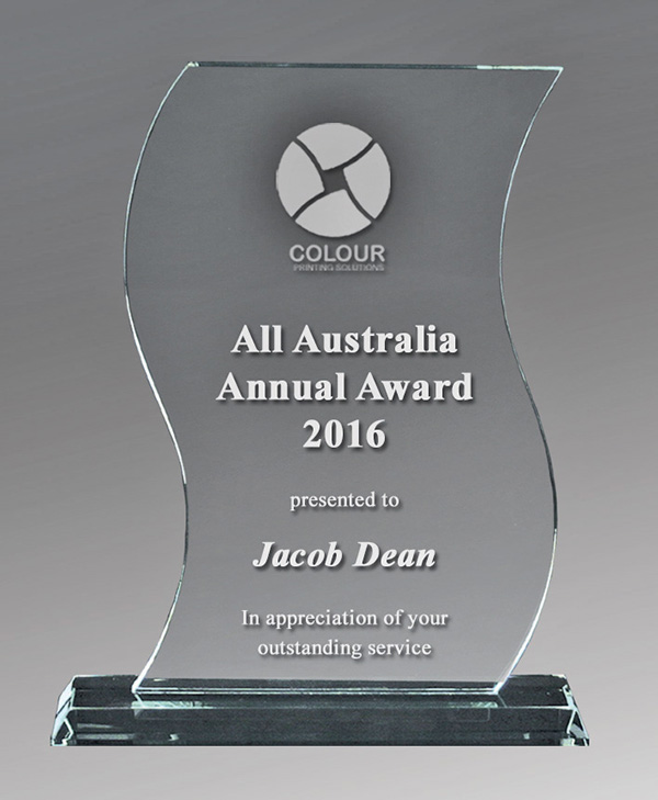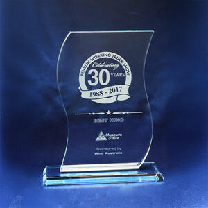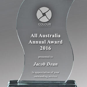 A distinctive glass award shaped with a graceful, ribbon-like curve. Crafted from glass and mounted on a matching rectangular base, it offers a contemporary style ideal for awards, recognition, or commemorative occasions. The substantial profile and smooth finish create an inviting canvas for personalised detailing, ensuring each achievement is honoured with clarity and sophistication.